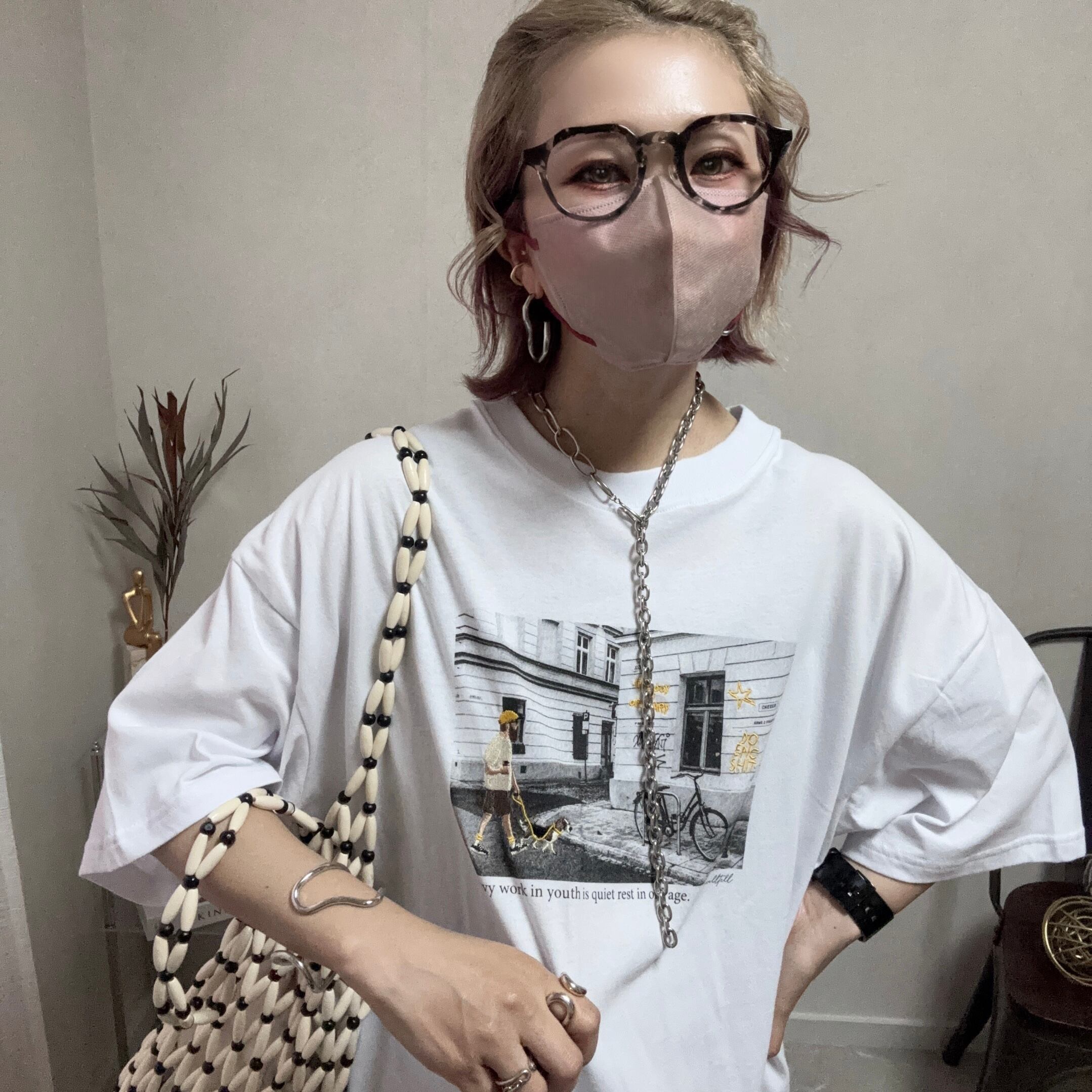 ハイメッシュで表現された風景写真のプリントに可愛いコミカルな刺繍がのせられています。
