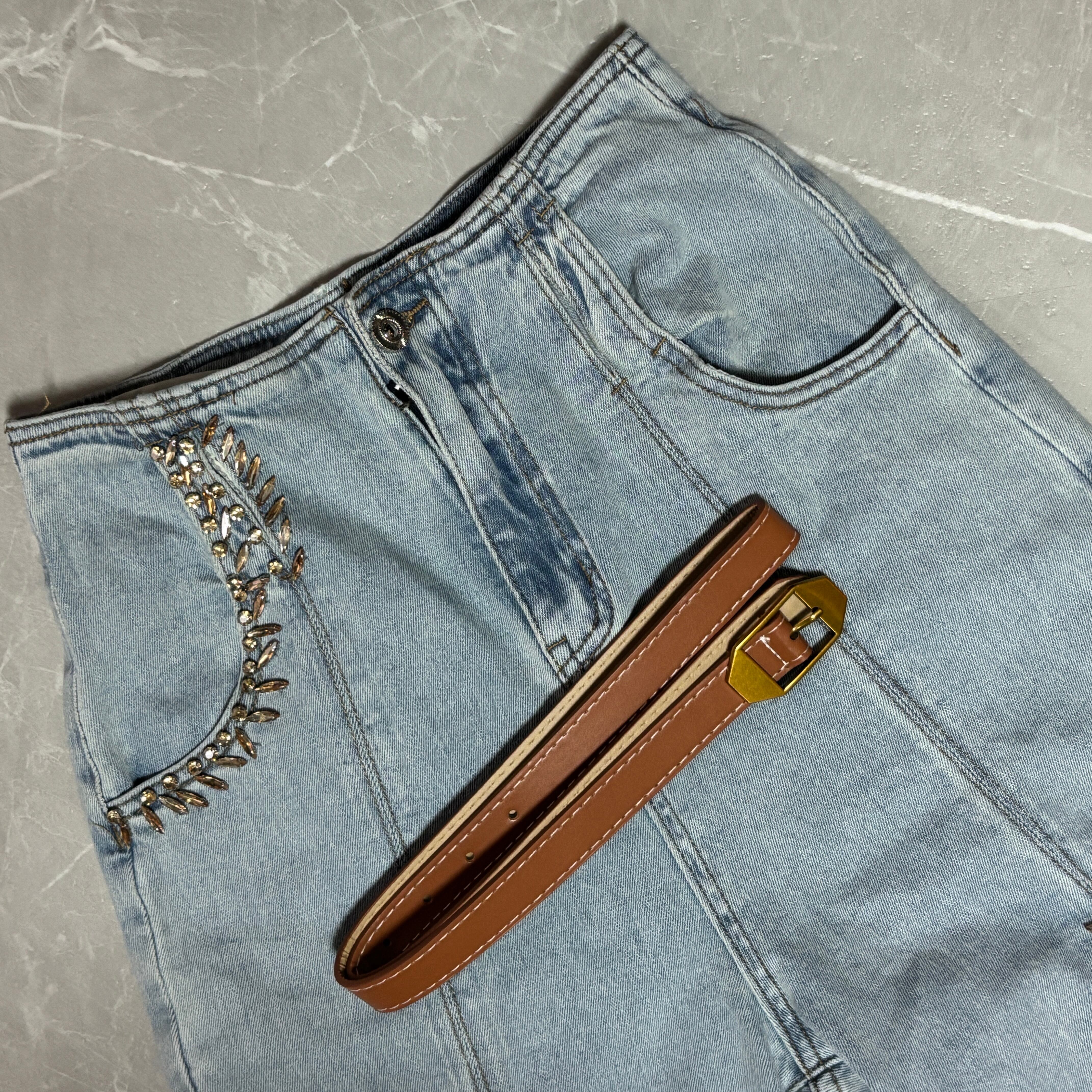 右ポケットのビジューも可愛く、あえてベルトを通しても高い位置に目線が行きスタイルアップ効果も◎