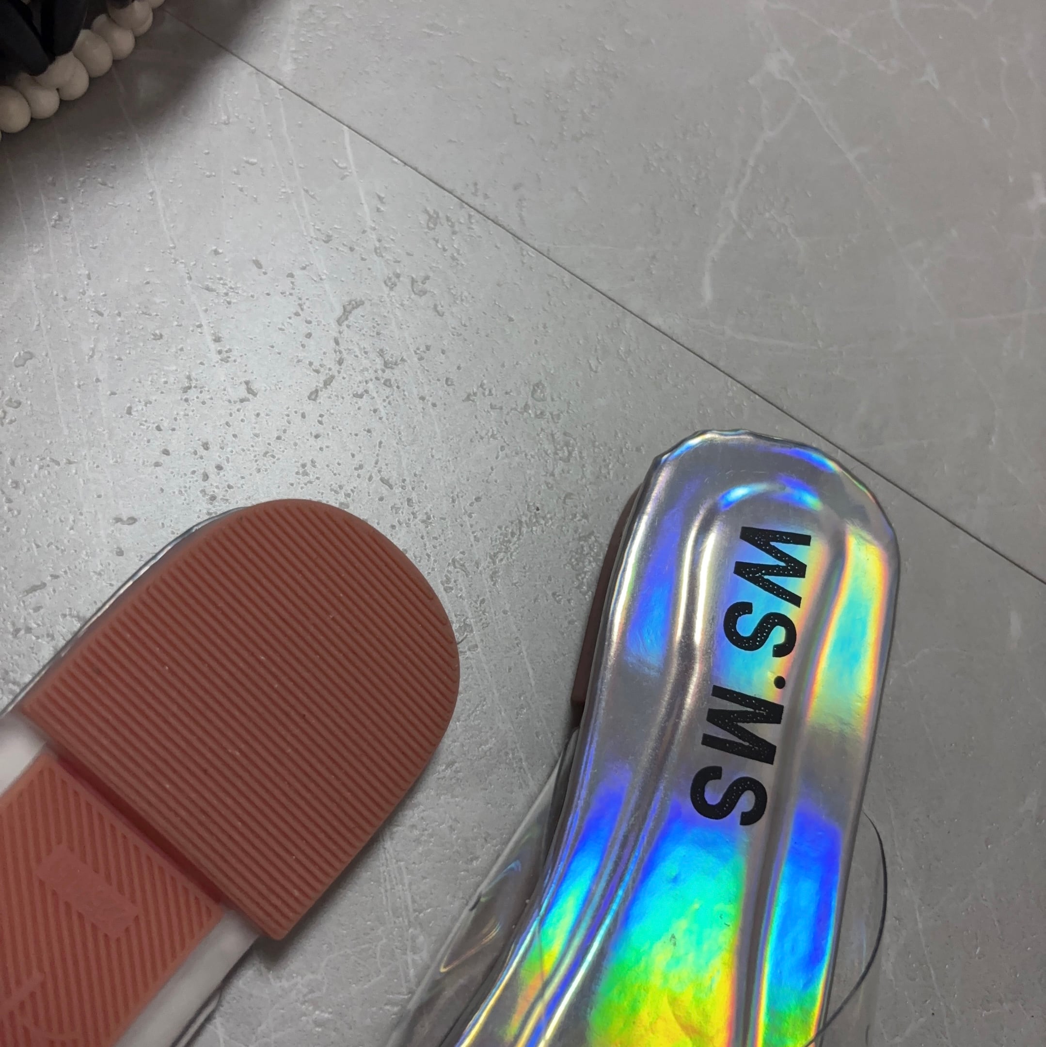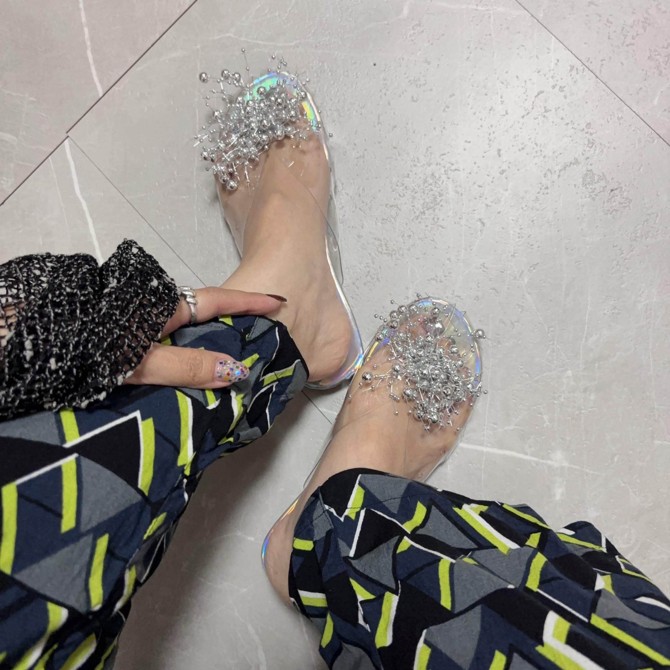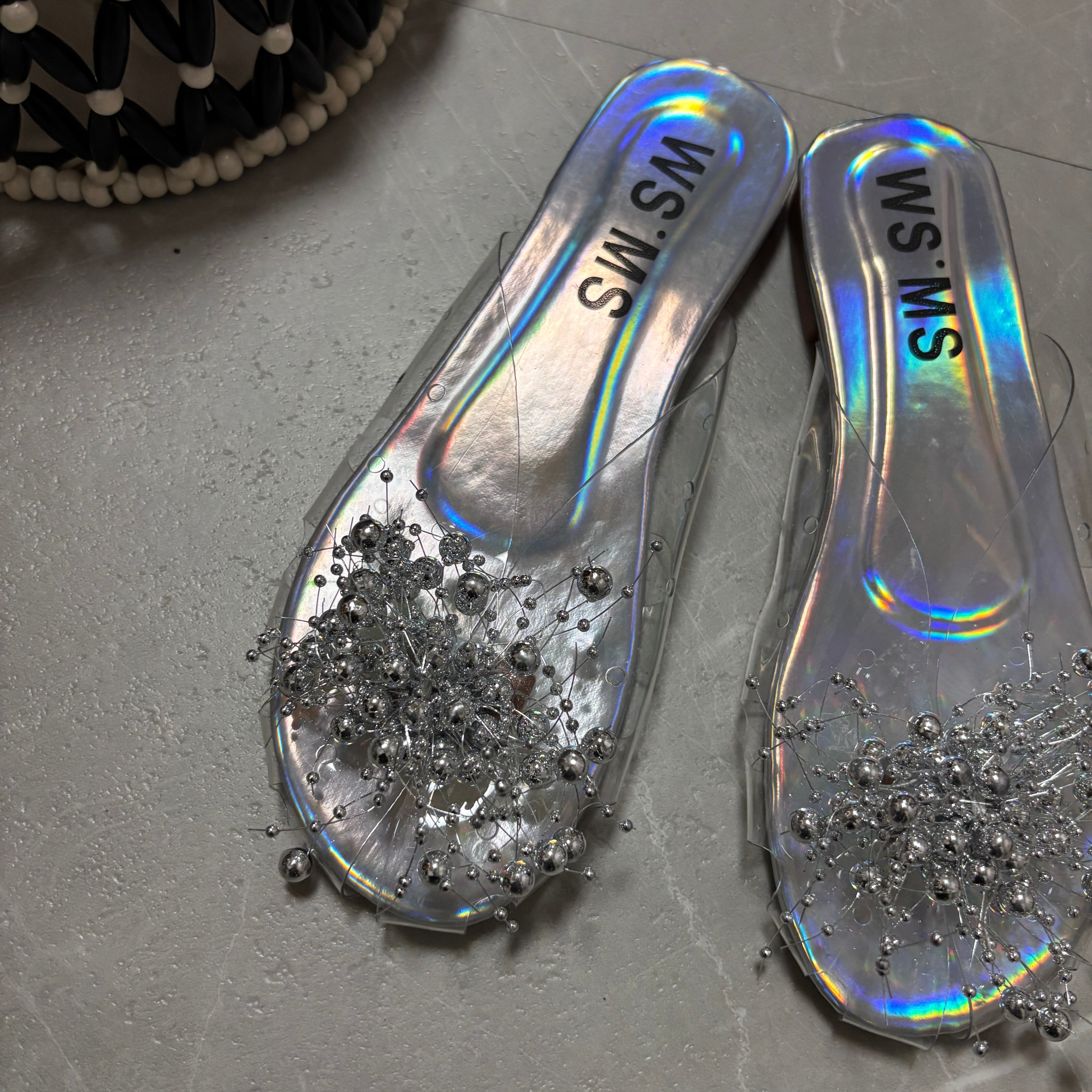オーバルアクセサリーが散りばめられ華やかさを演出する、ビニール素材のフラットサンダル♡