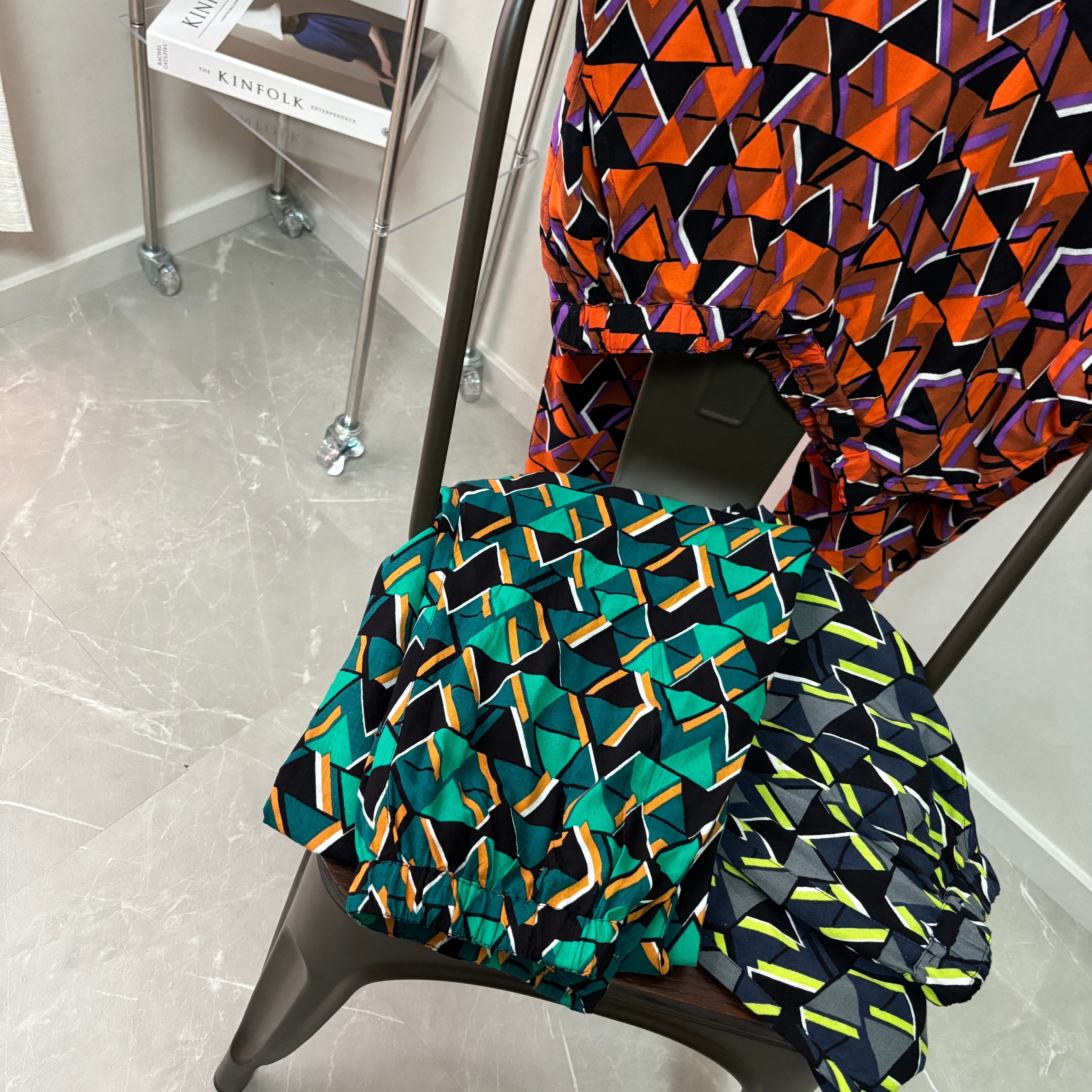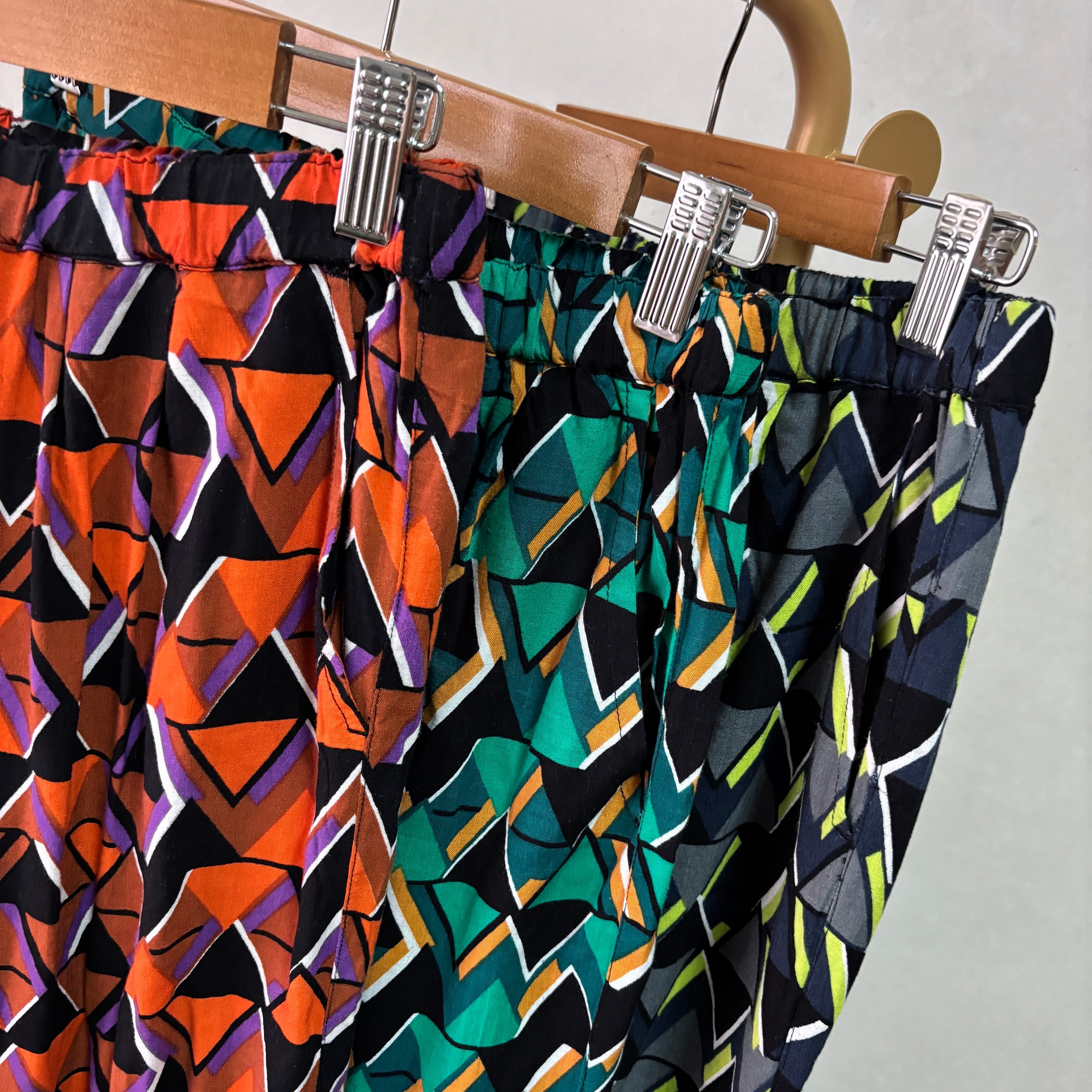 鮮やかで綺麗な目を惹くジオメトリック柄のイージーパンツで、ゆったりリラックスできるような履き心地。