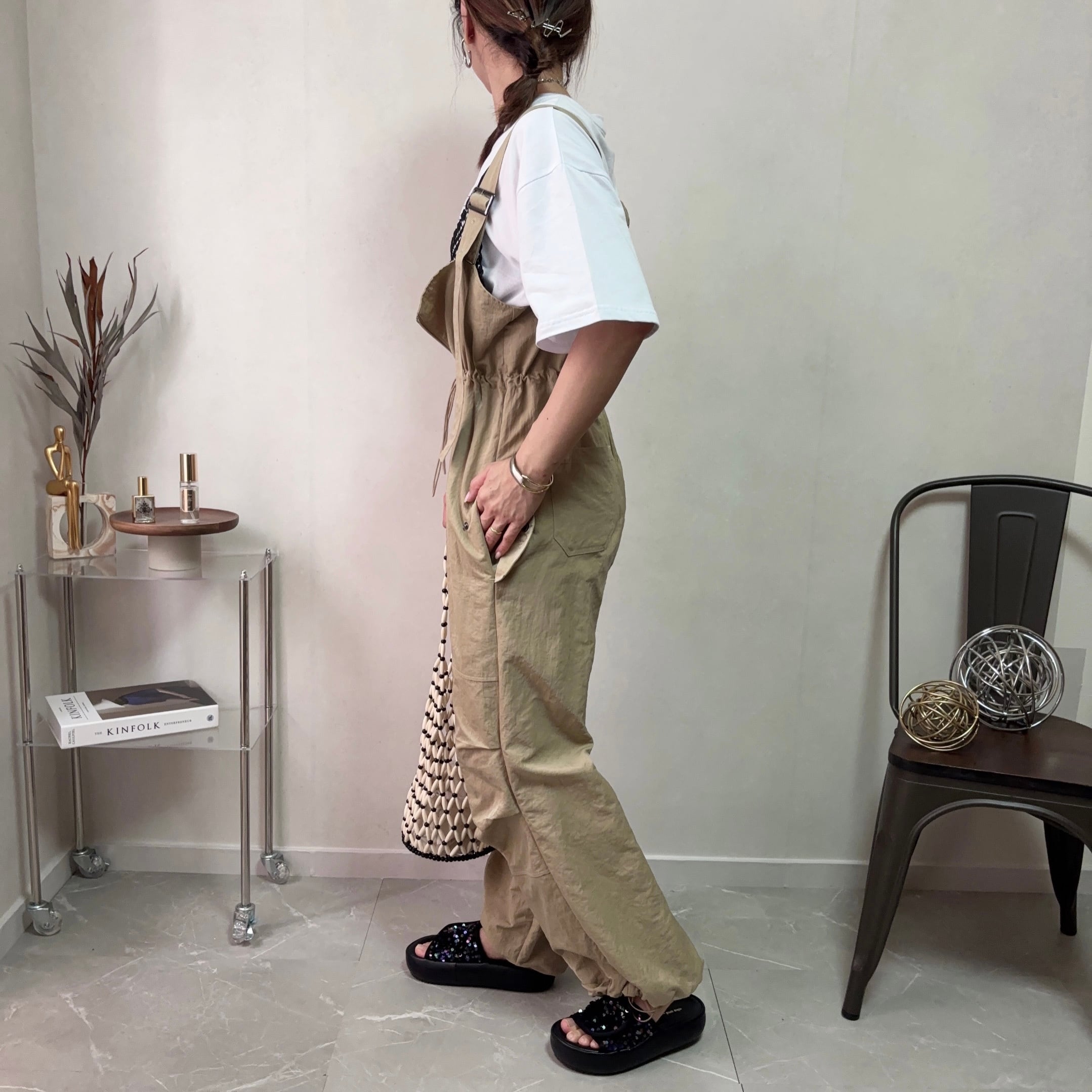 nylon front zip west gathe salopette【beige】