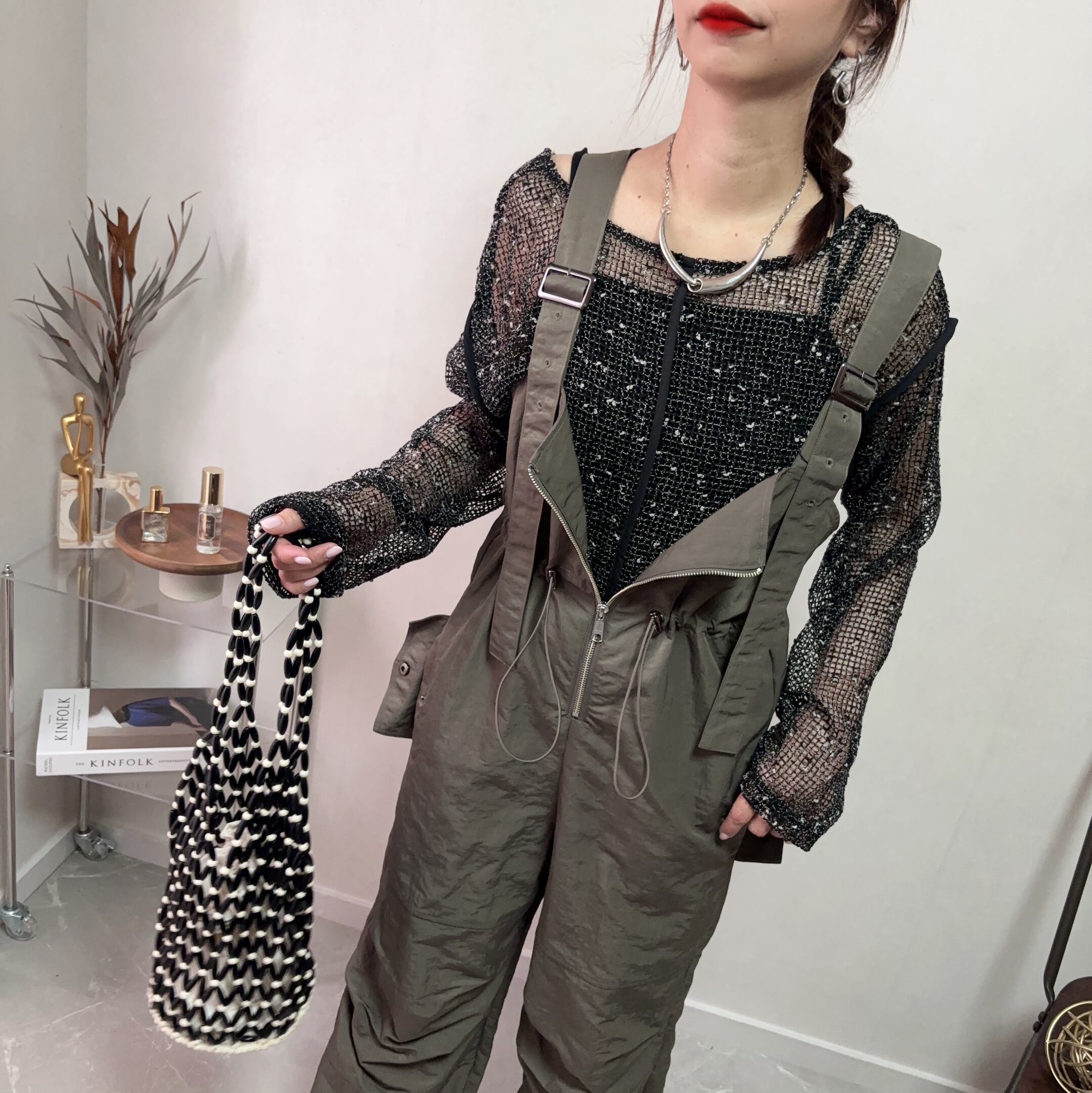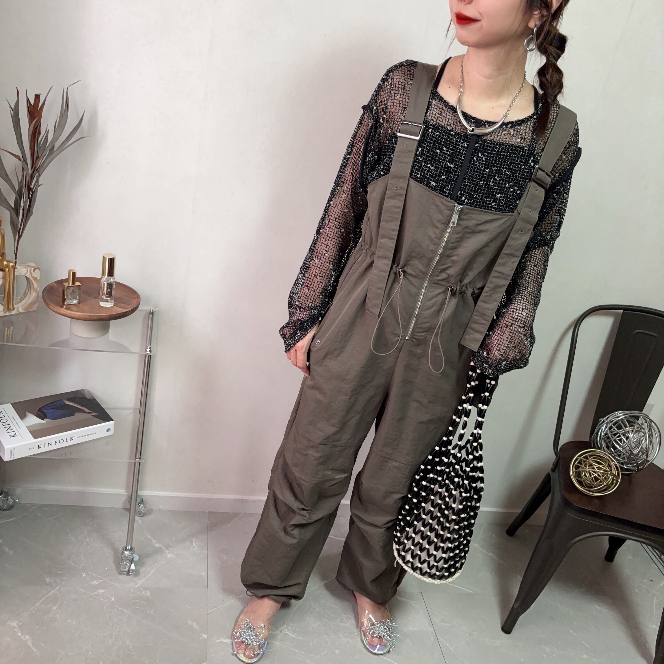 nylon front zip west gathe salopette【khaki】