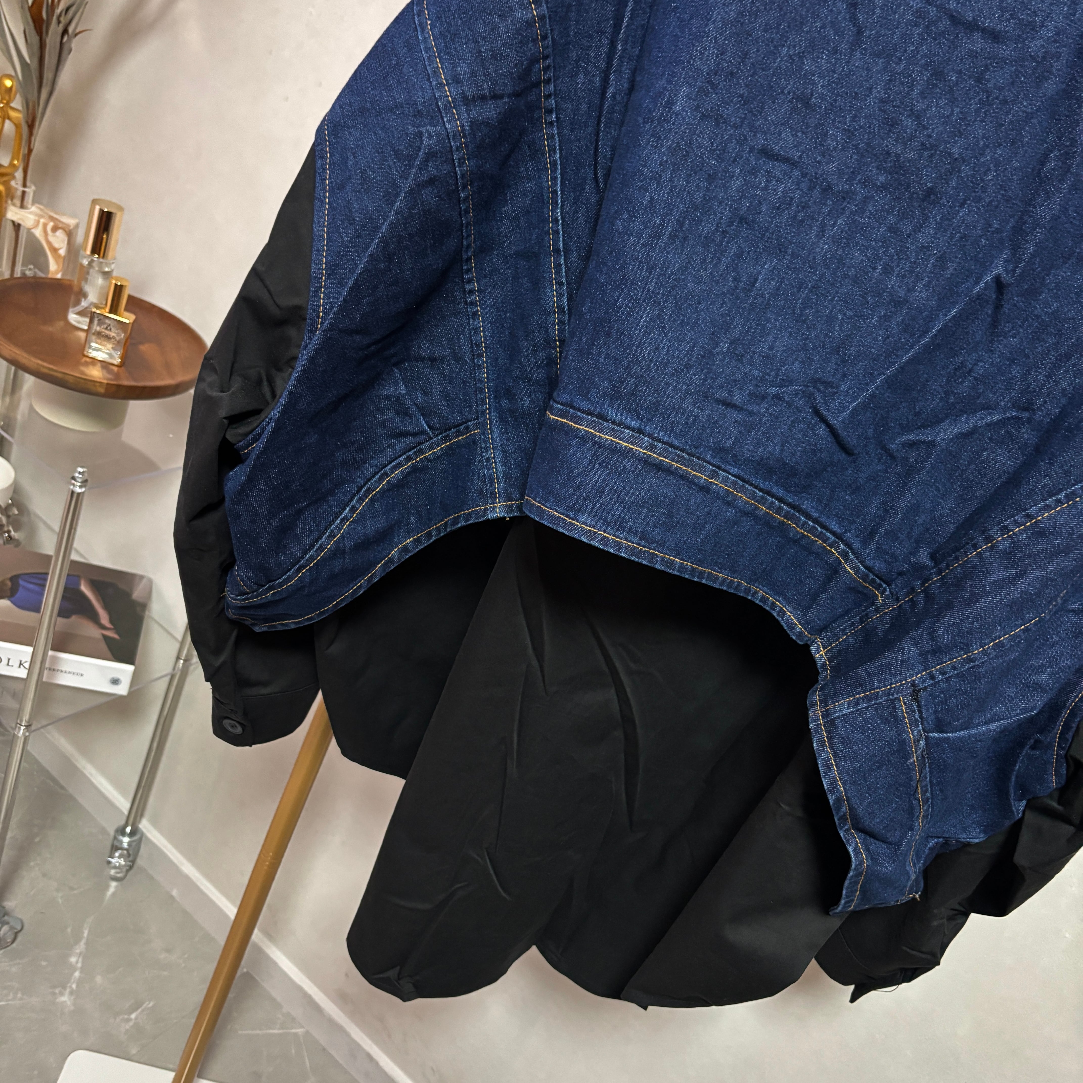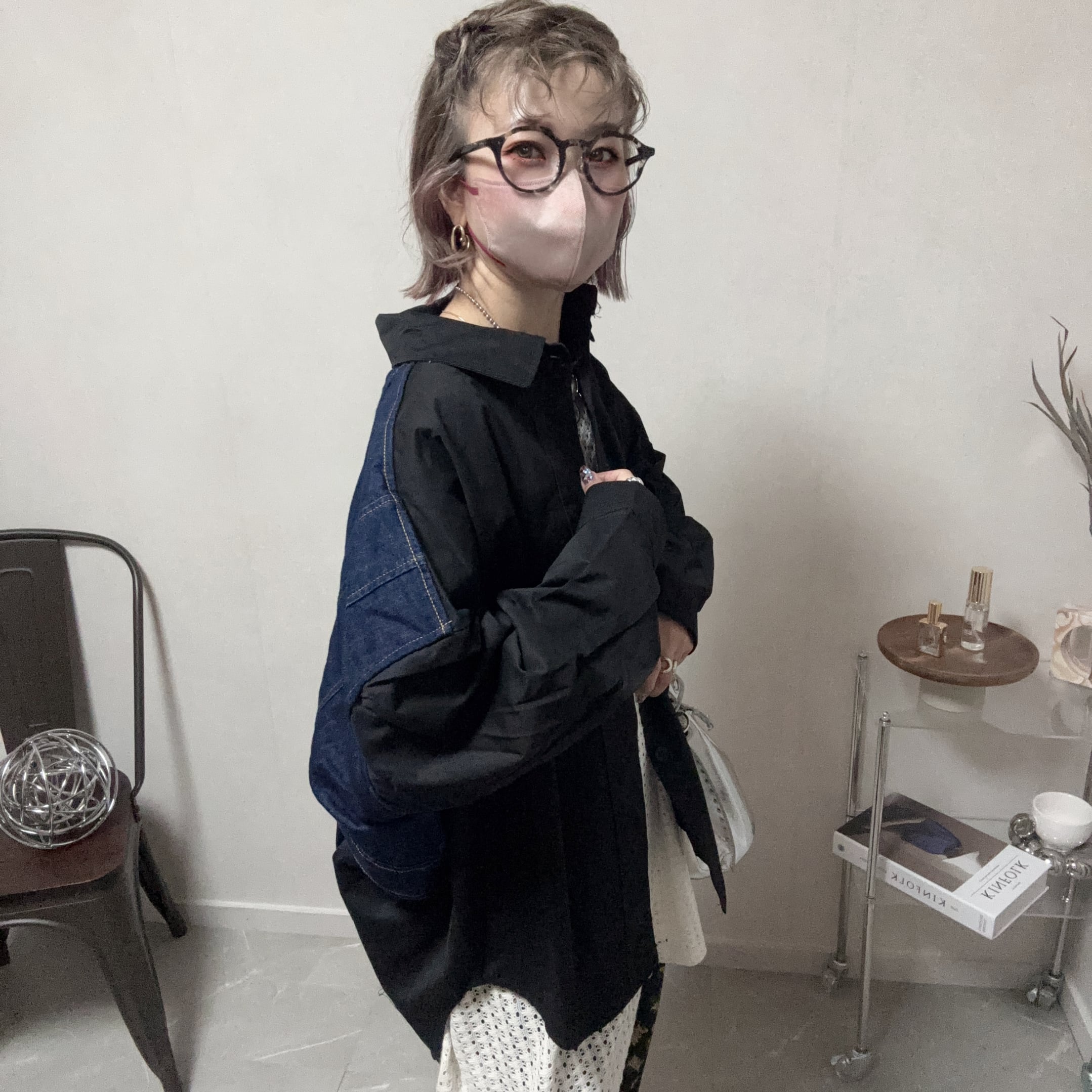 しっかりしたデニム生地の部分と、異なる質感の生地が絶妙に調和し、存在感のあるデザインに仕上がっています◎