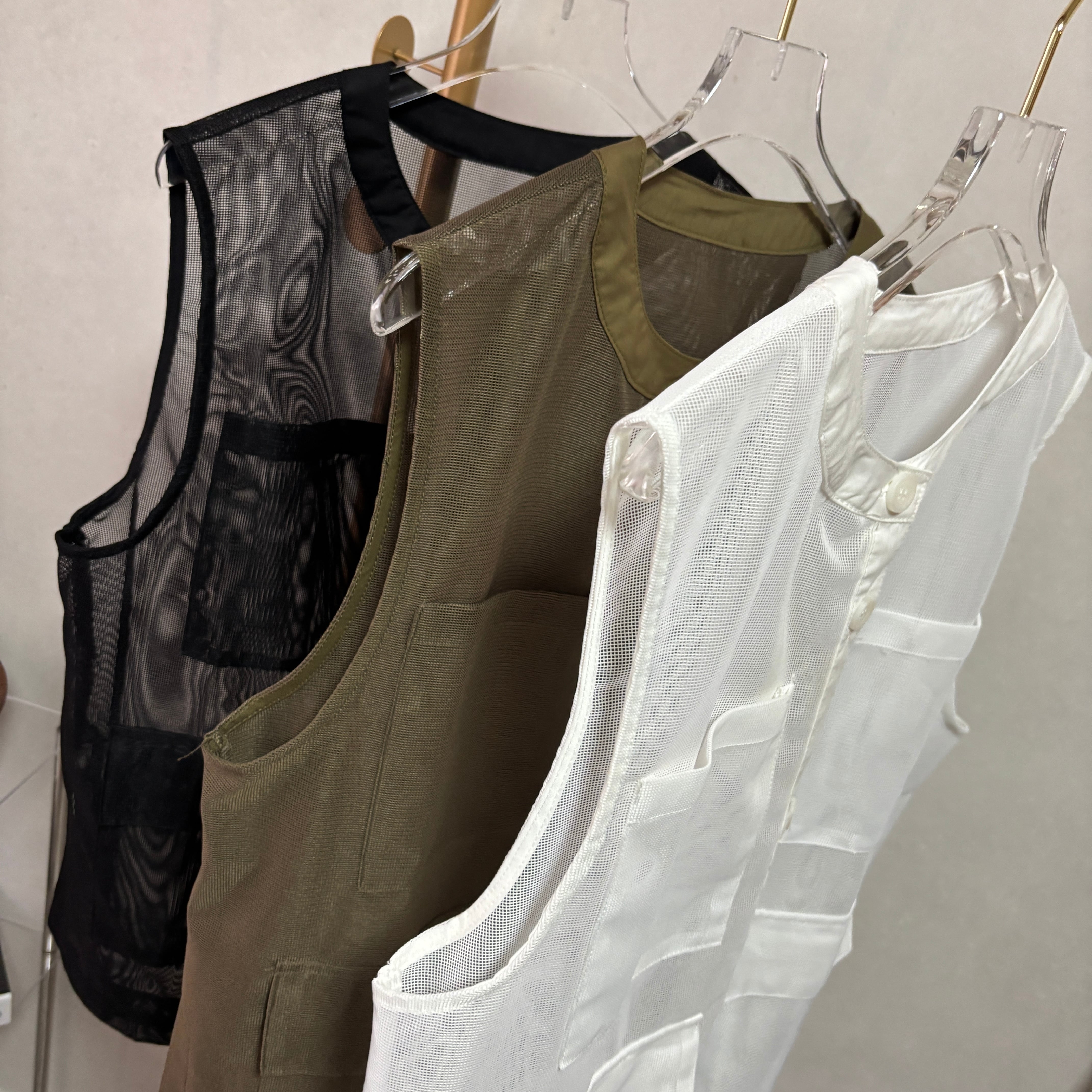 ポケットのたくさんついたフロントデザインが印象的なアイテムで、おしゃれと快適さを兼ね備えたメッシュベスト。