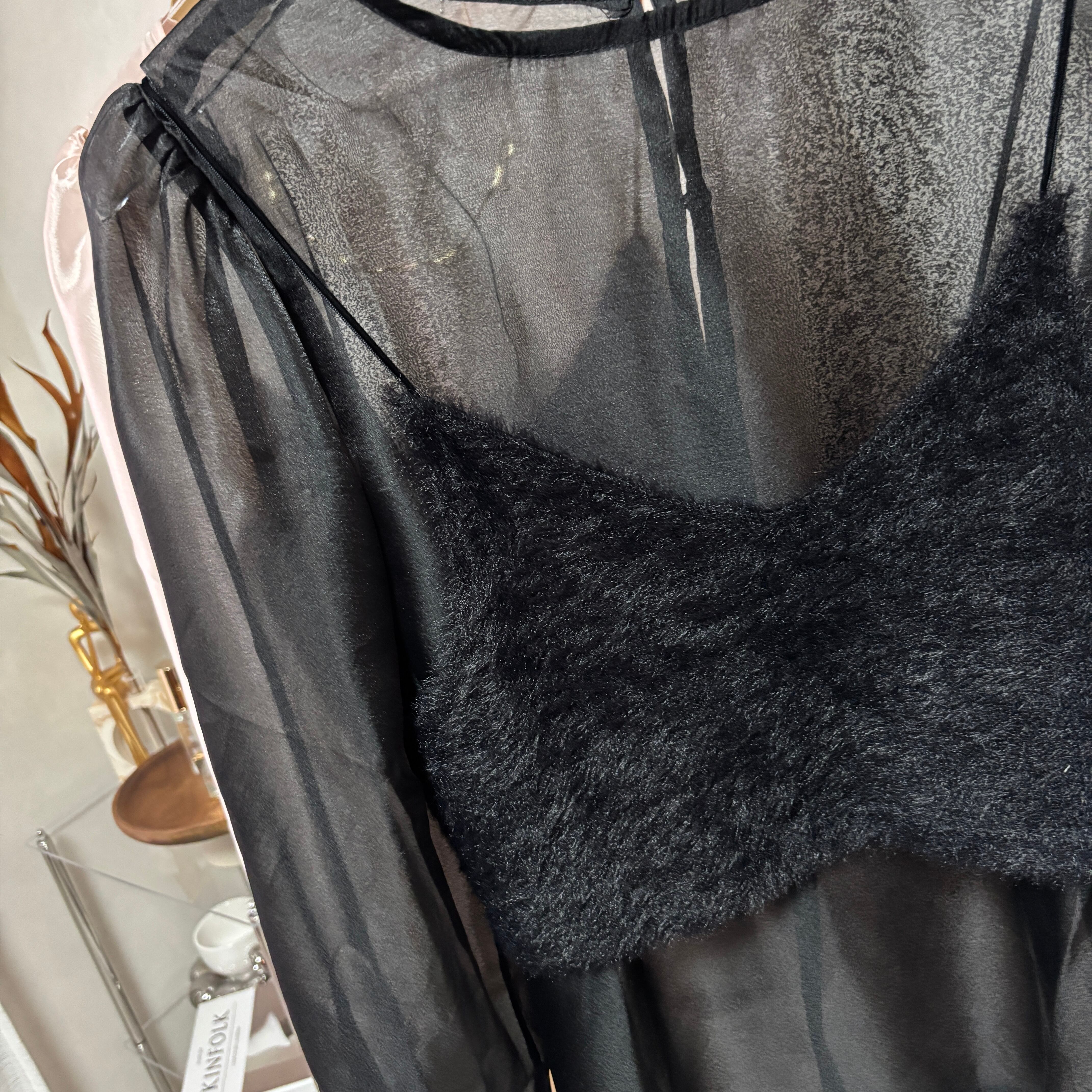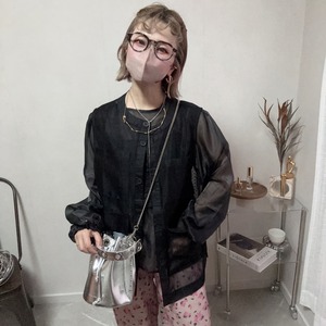 sheer blouse × shaggy bustier set【Black】