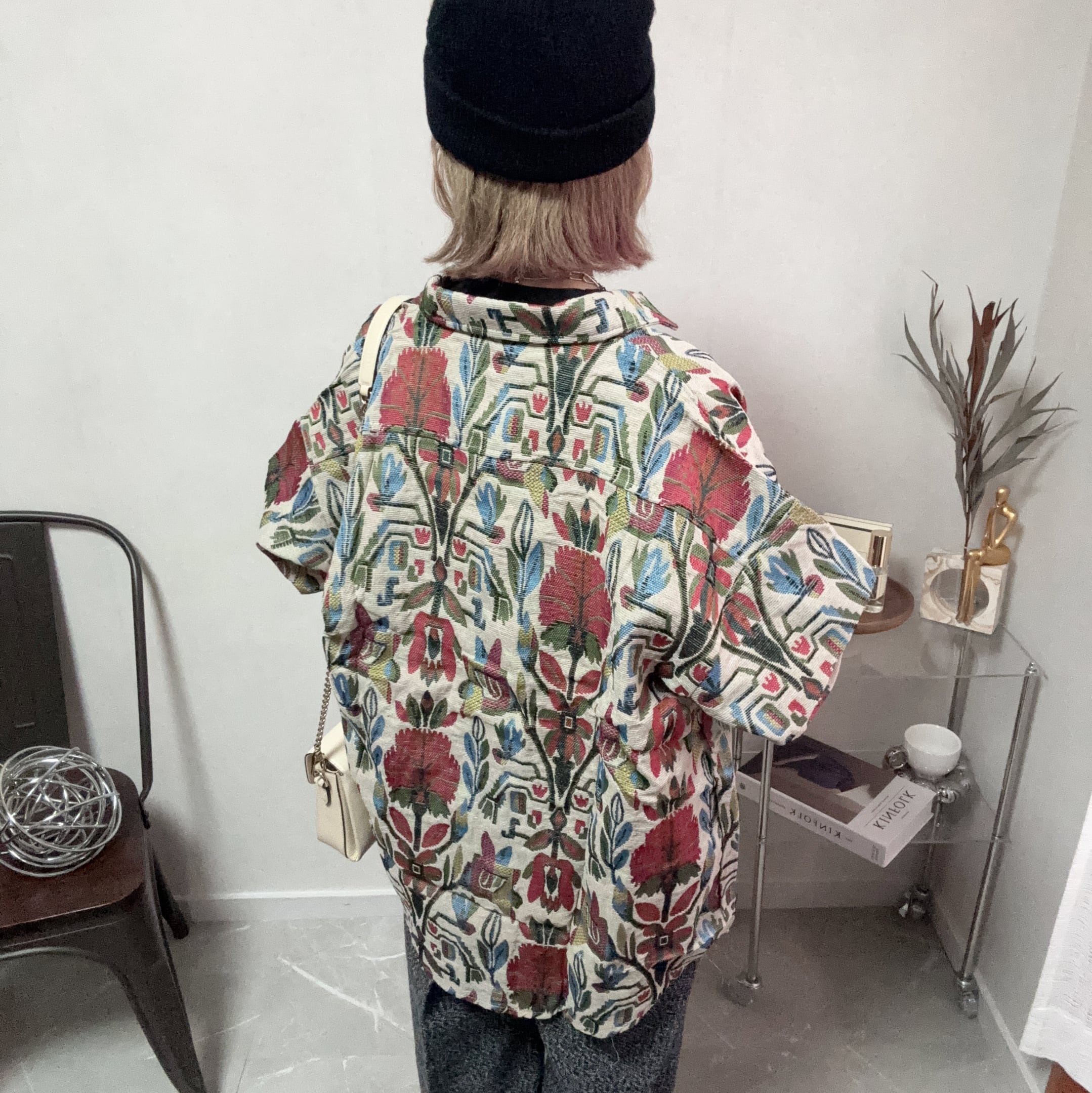 オーガニックなヘンプの魅力を感じるボタニカル柄でビッグシルエット。