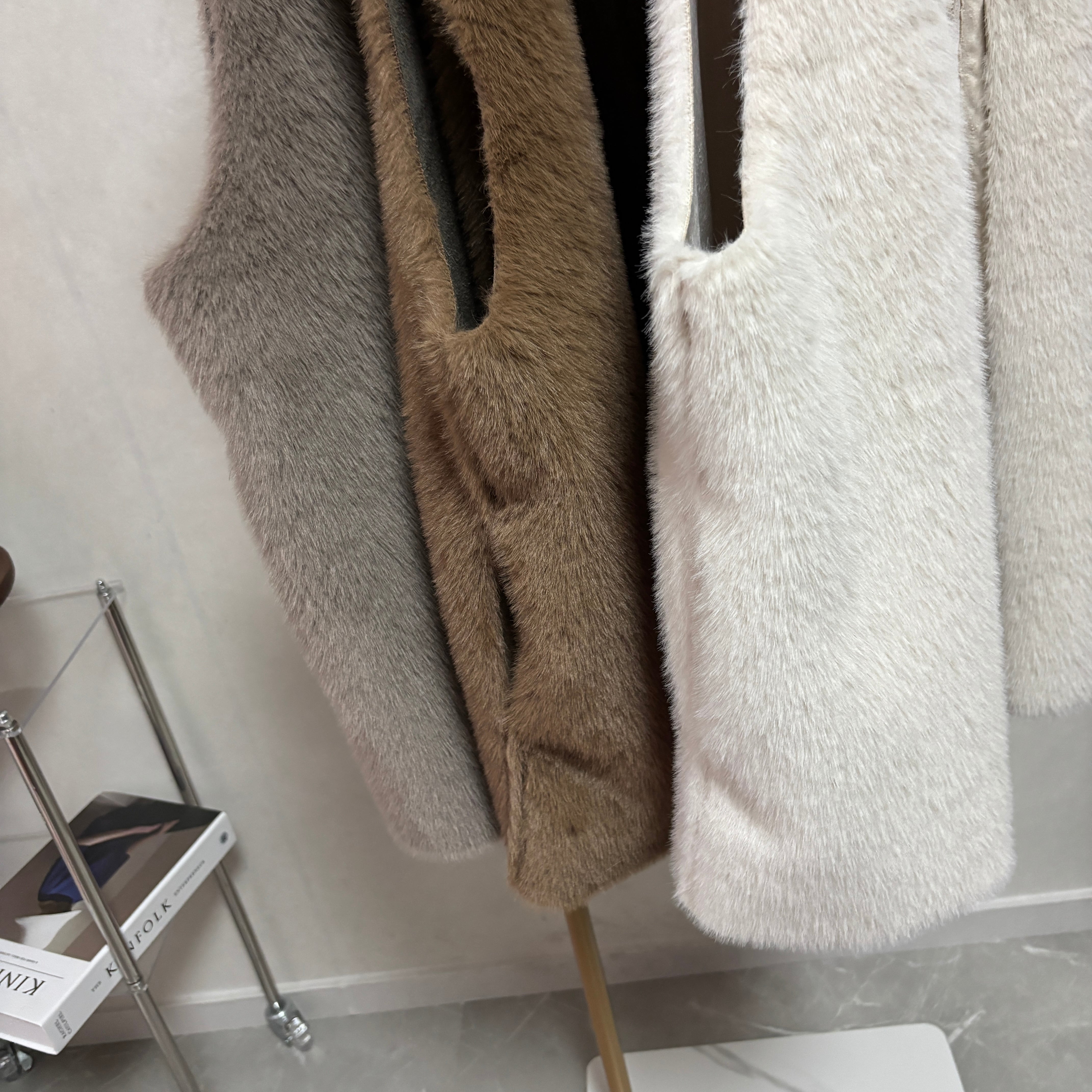 ラビット風エコファーとフェイクスエードのリバーシブル仕様で、1枚で異なる表情を楽しめるベストです。