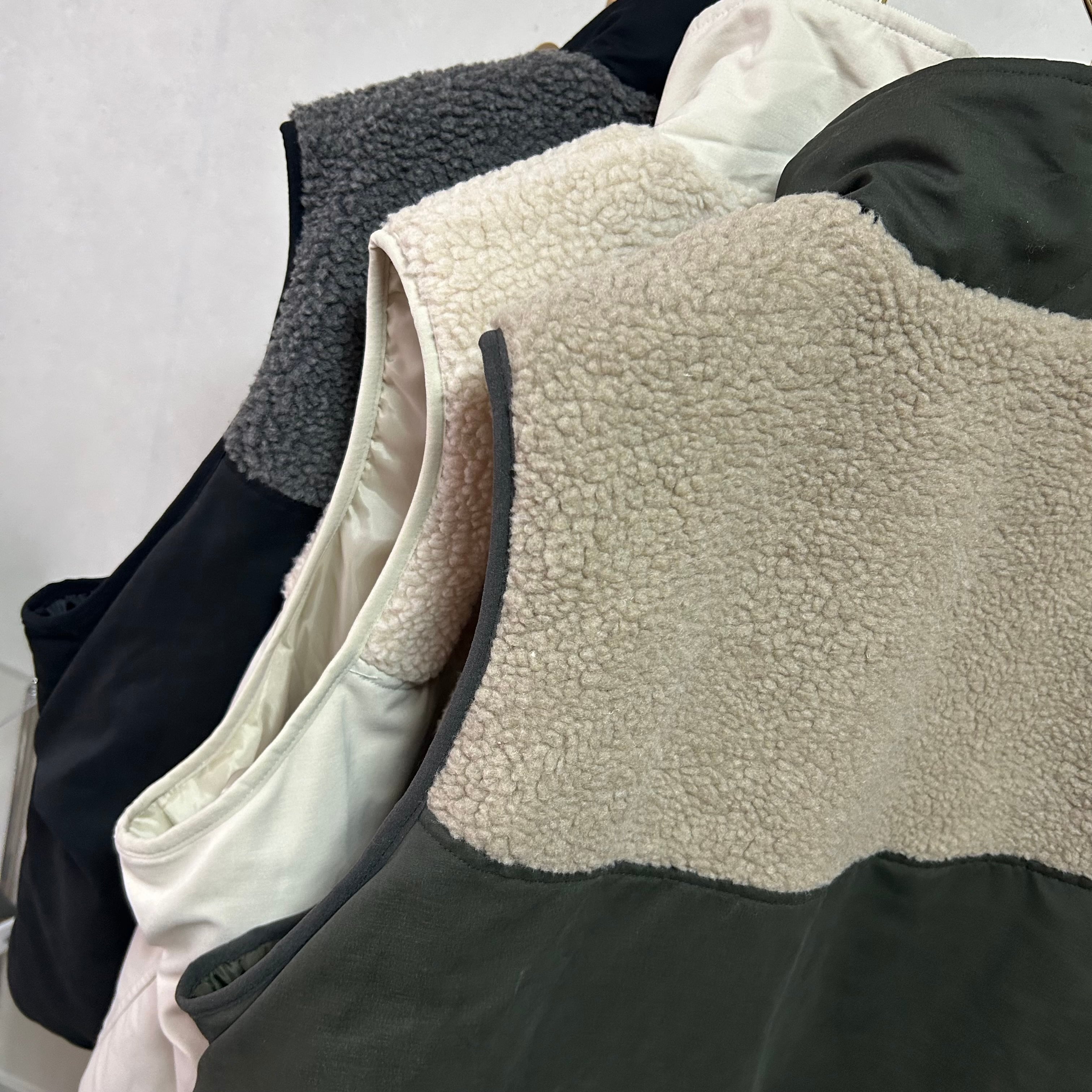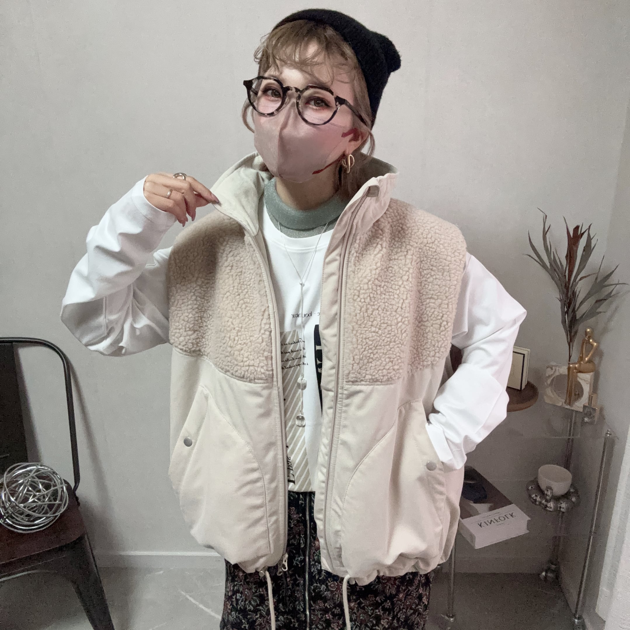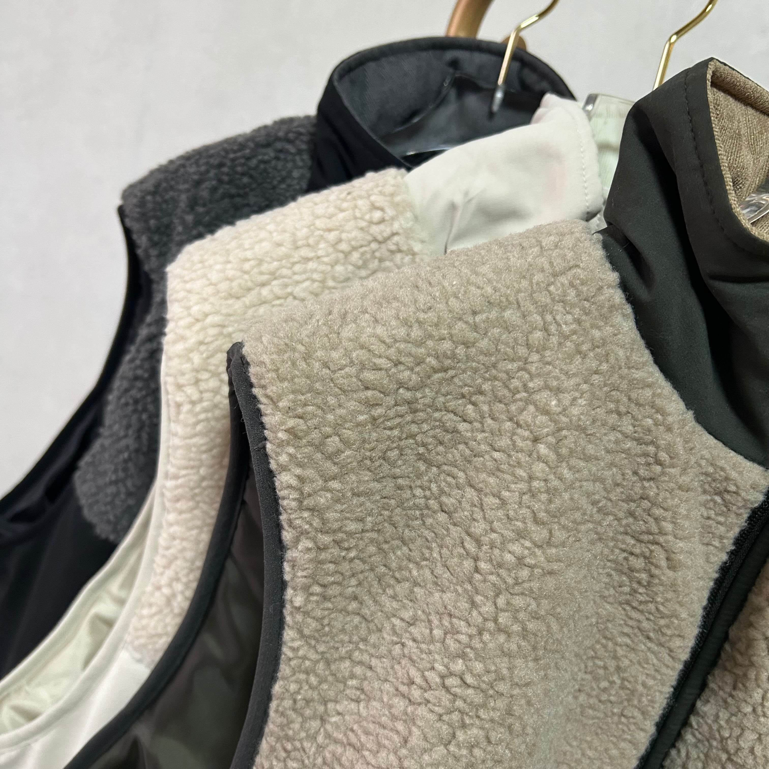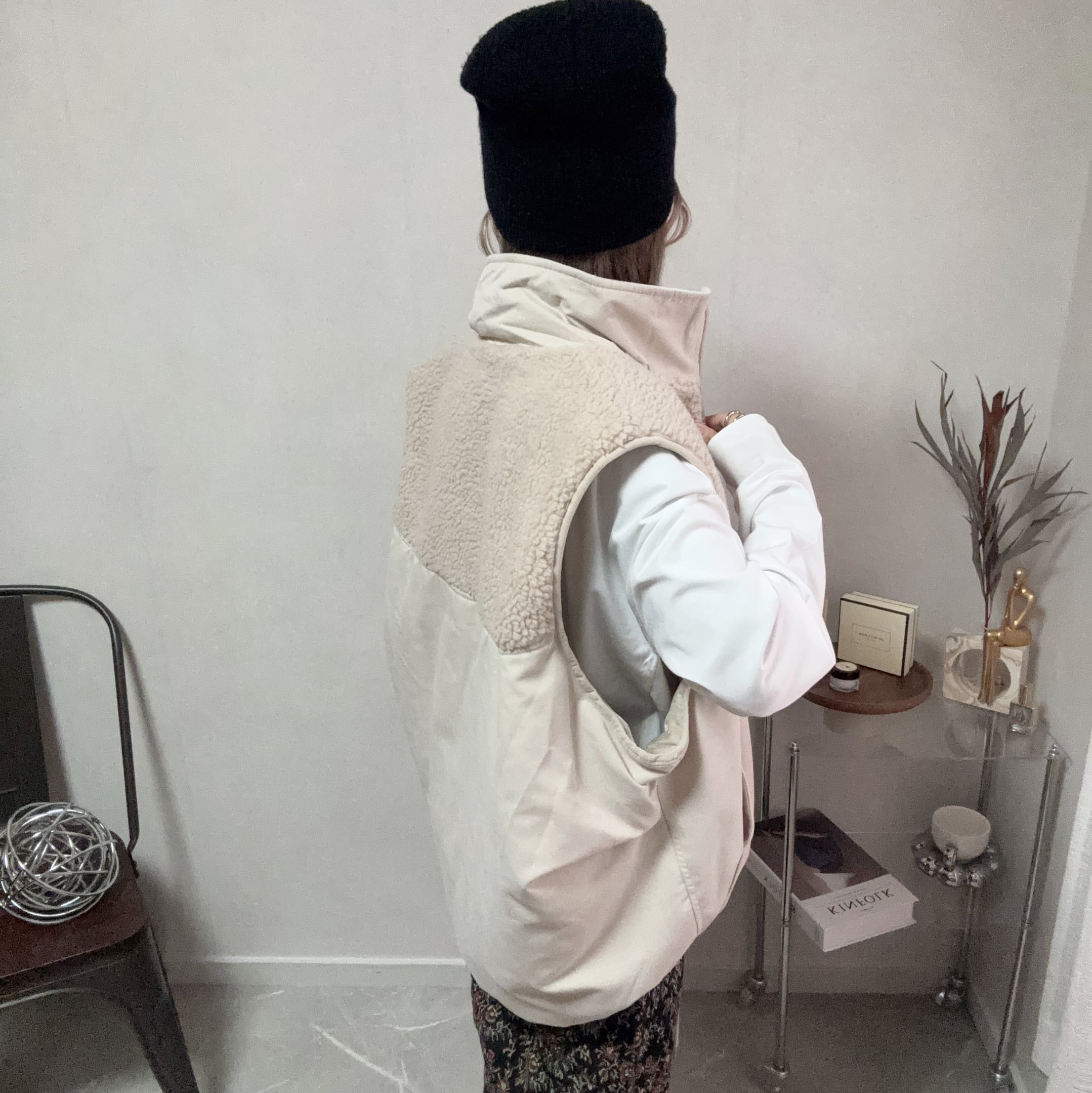 高見えでおしゃれなボア切り替えが特徴の中綿ベスト。