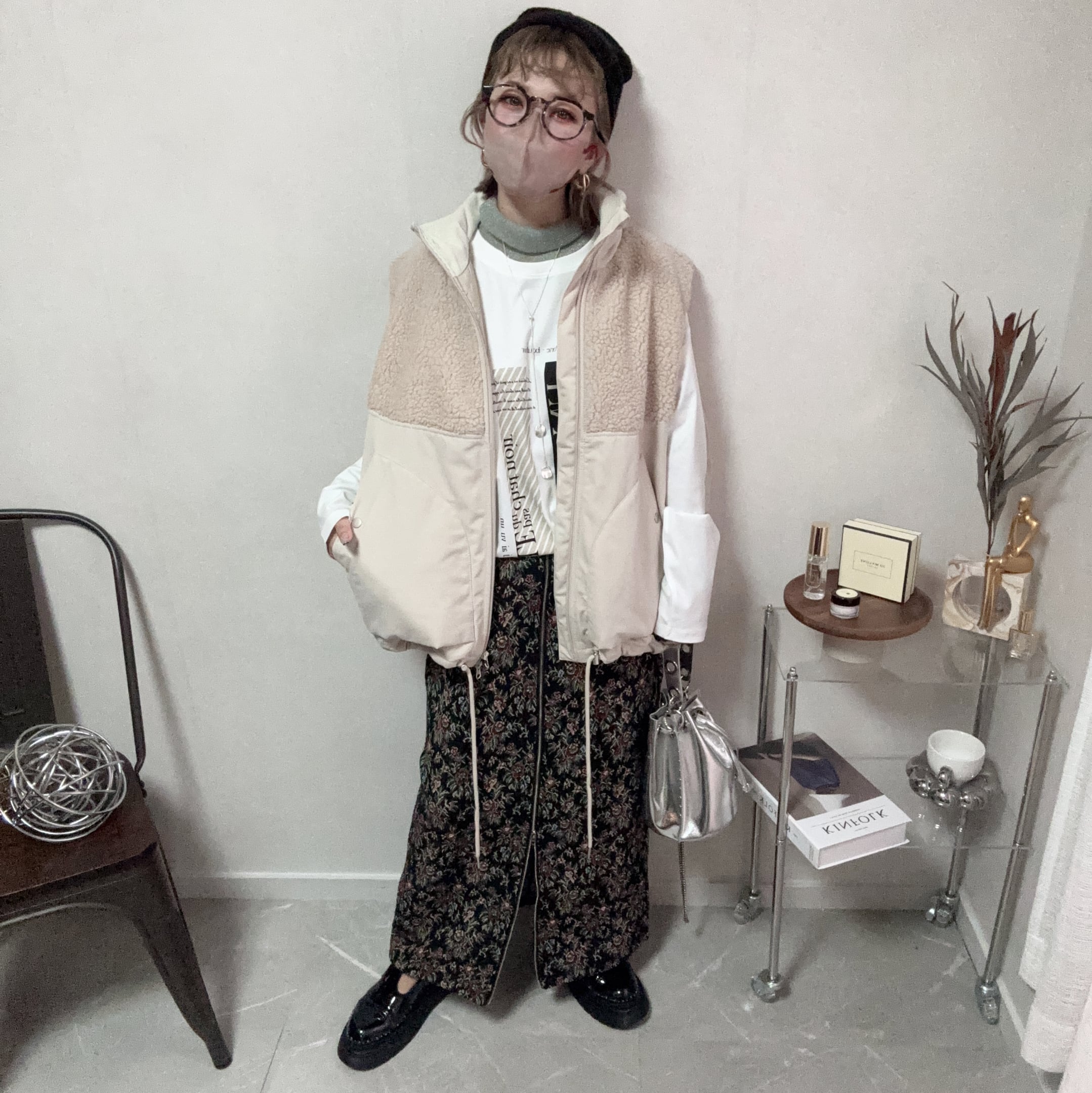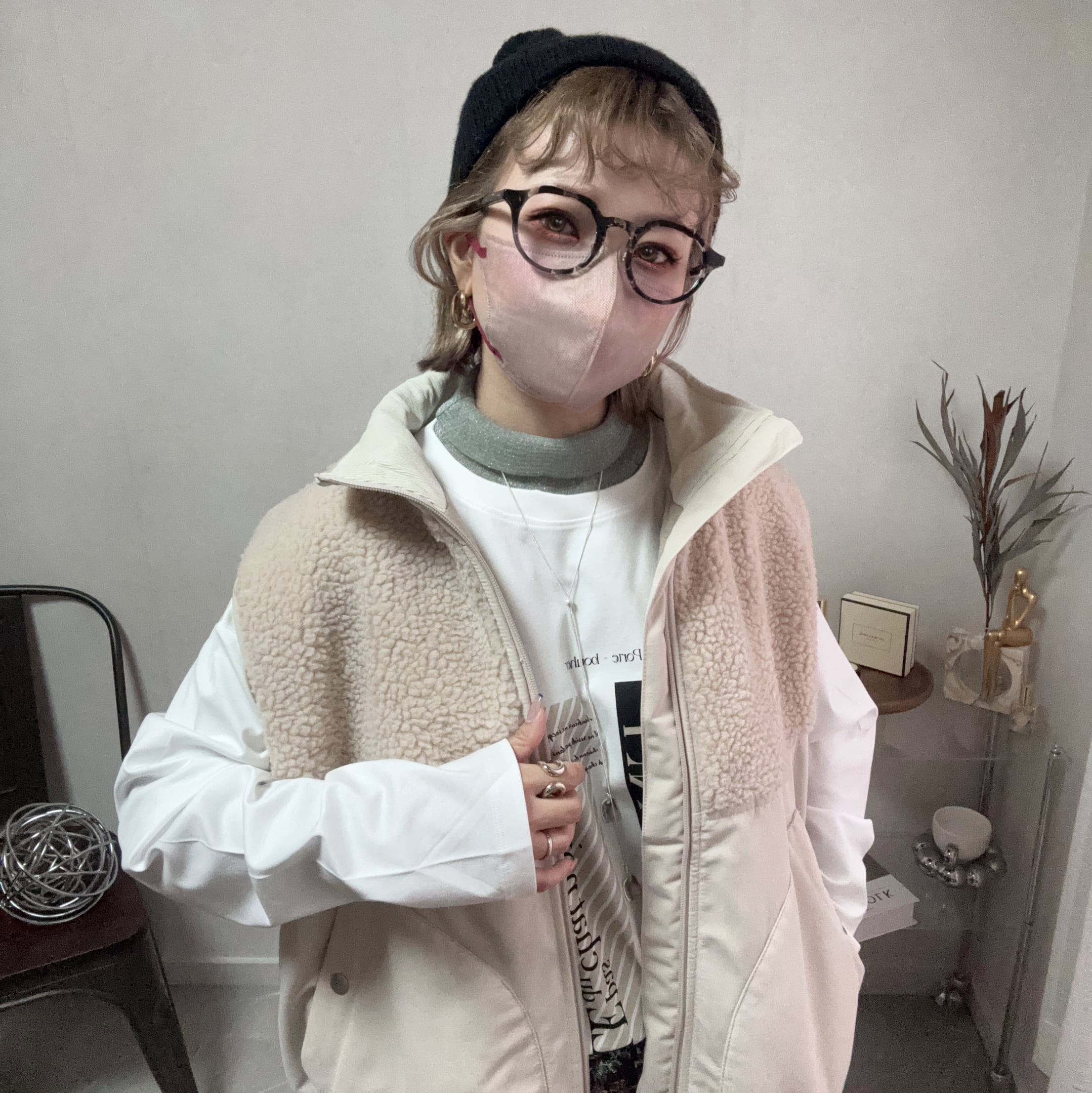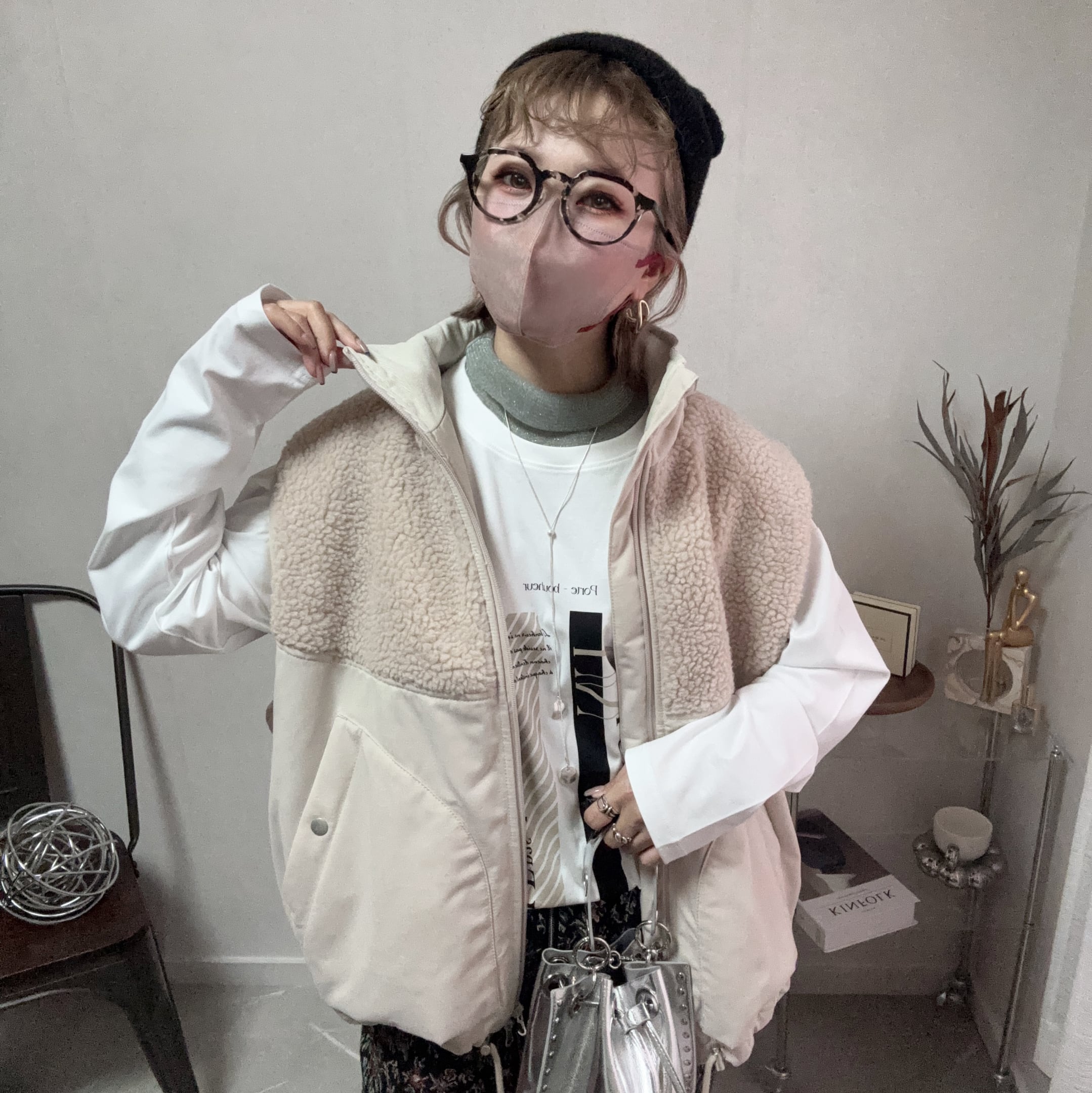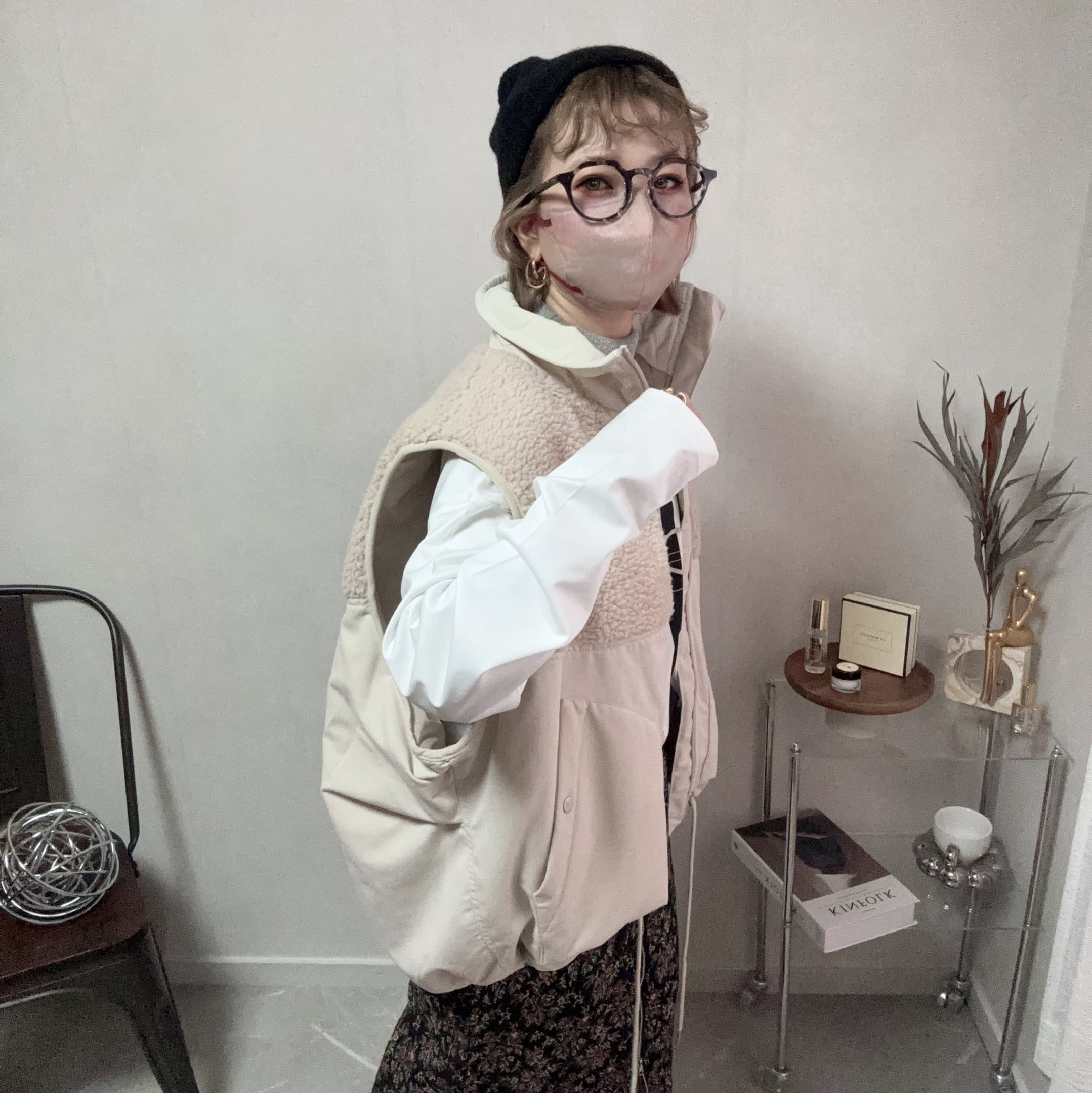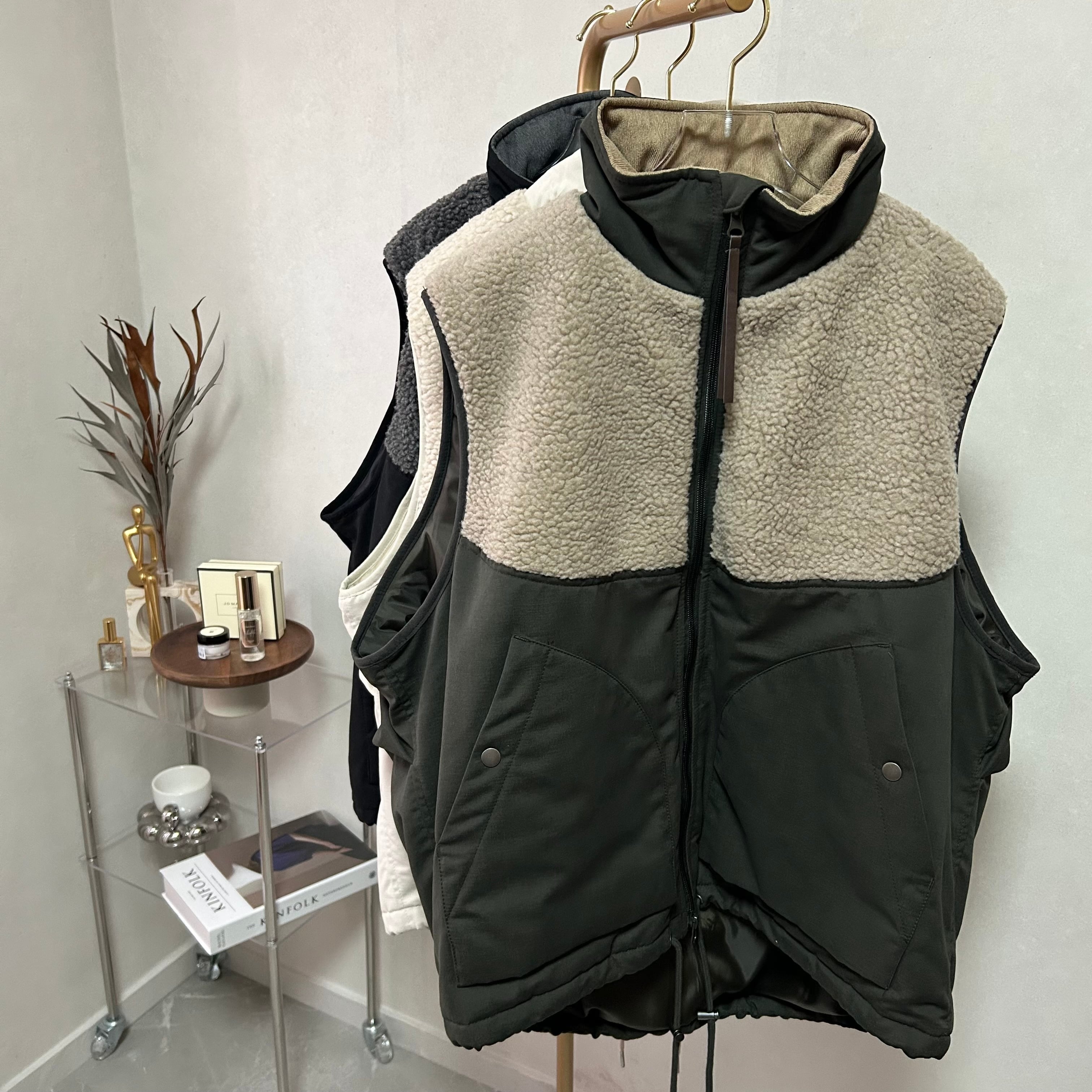 高見えでおしゃれなボア切り替えが特徴の中綿ベスト。