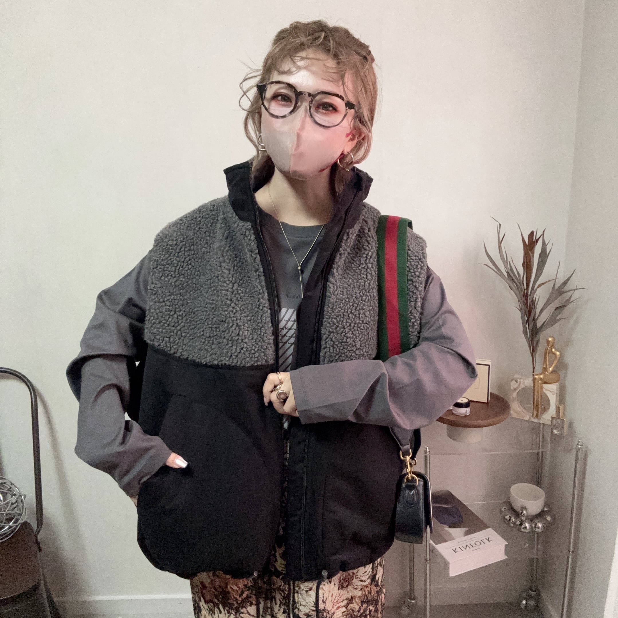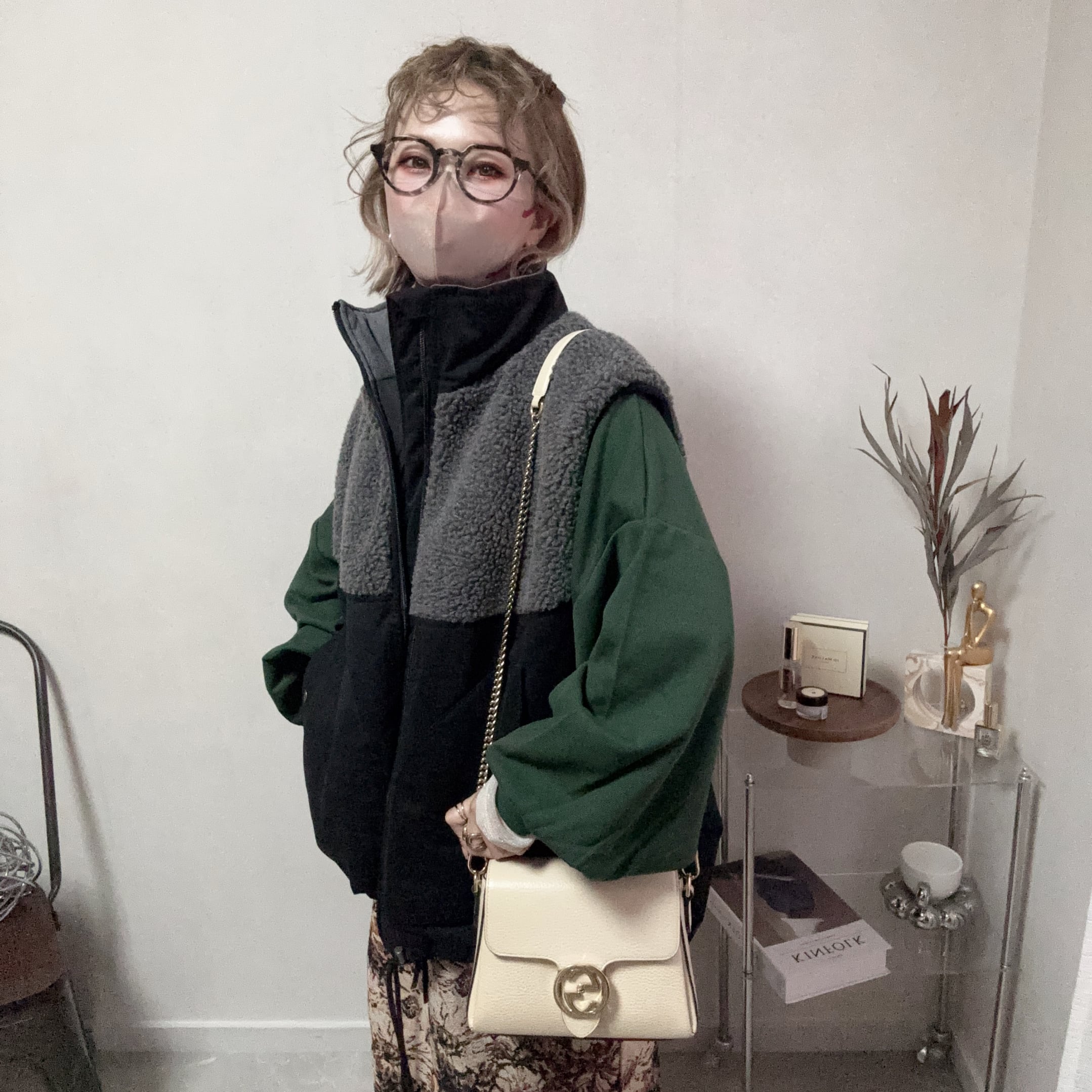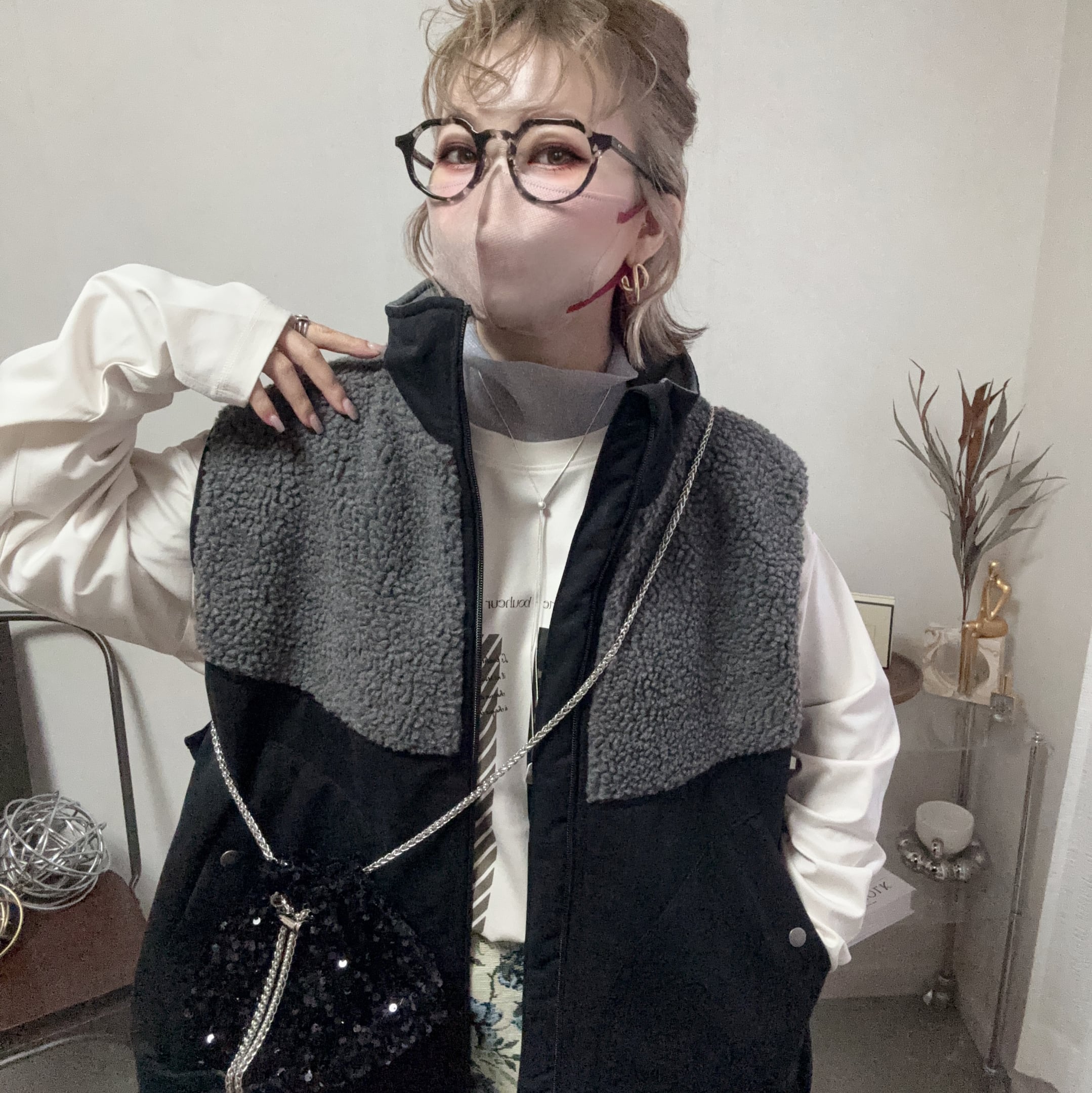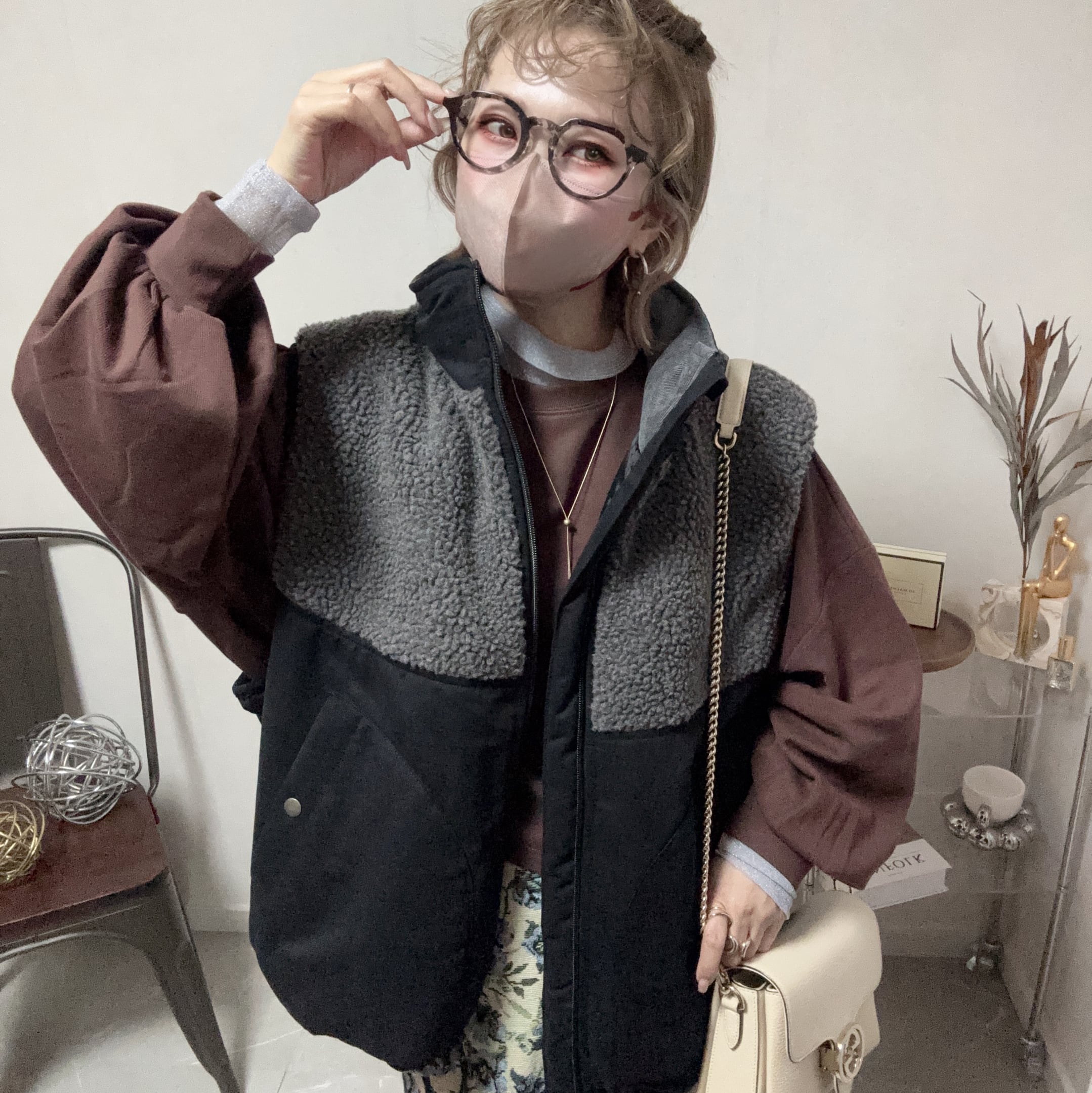 高見えでおしゃれなボア切り替えが特徴の中綿ベスト。