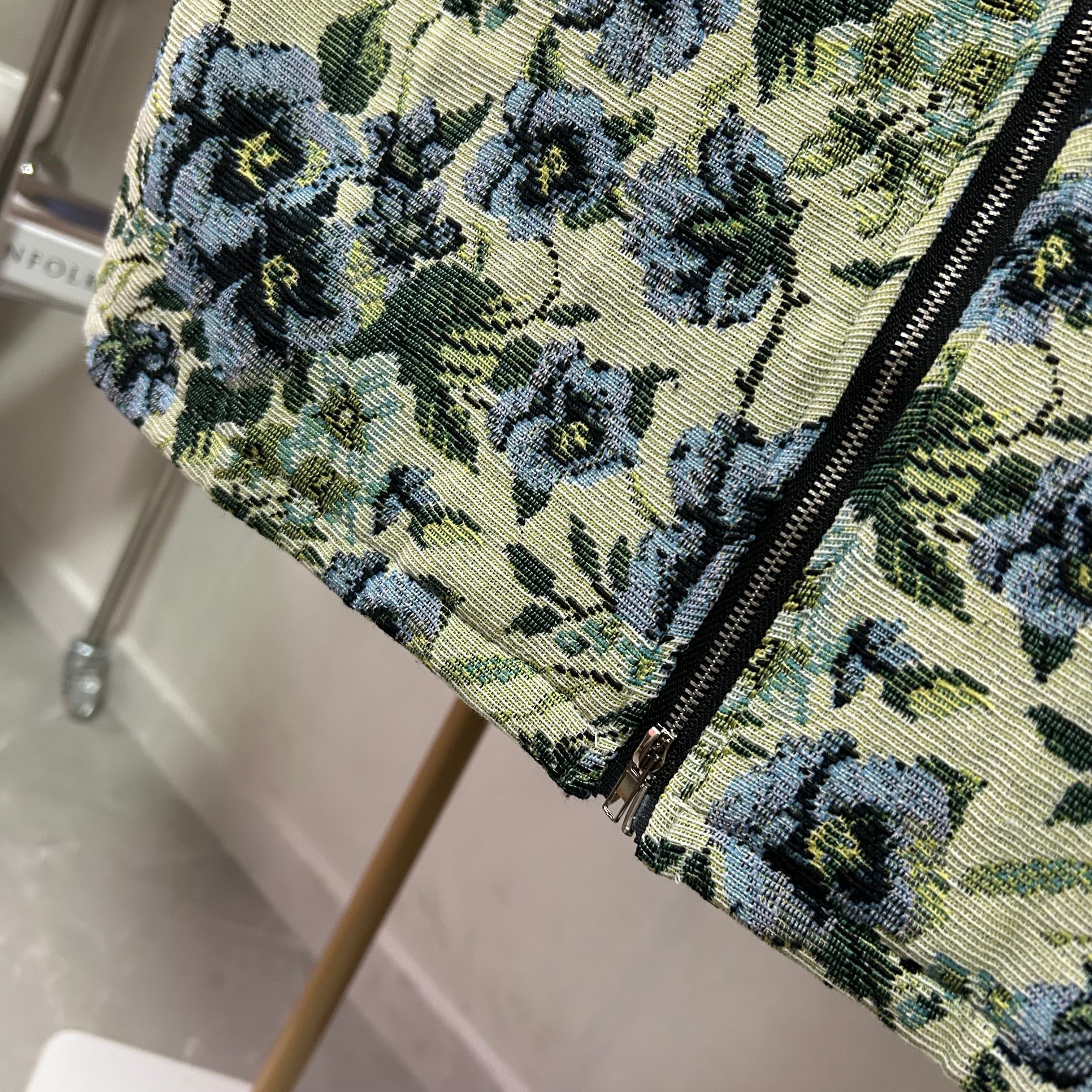 ヴィンテージ感漂う3種類のフラワー柄ゴブランのフロントジップタイトスカート。