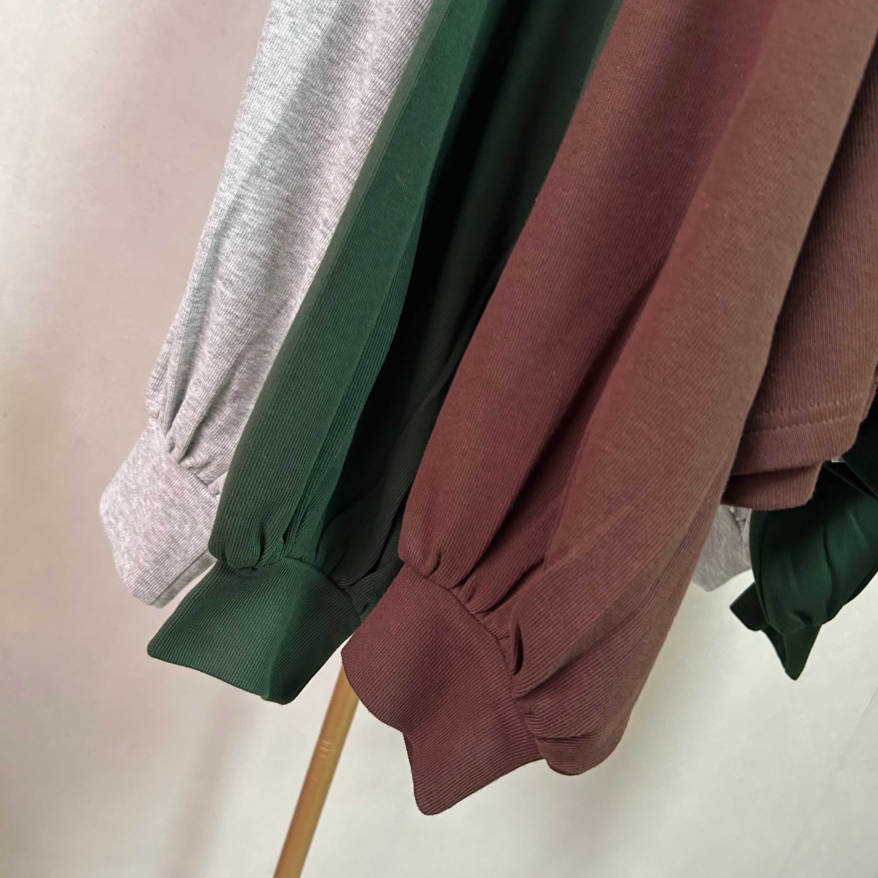 肩の力を抜いたオーバーサイズシルエットに、たっぷりとボリュームをもたせた袖が印象的。袖口はギャザー仕様で丸みをもたせ、フェミニンさと遊び心をプラス+