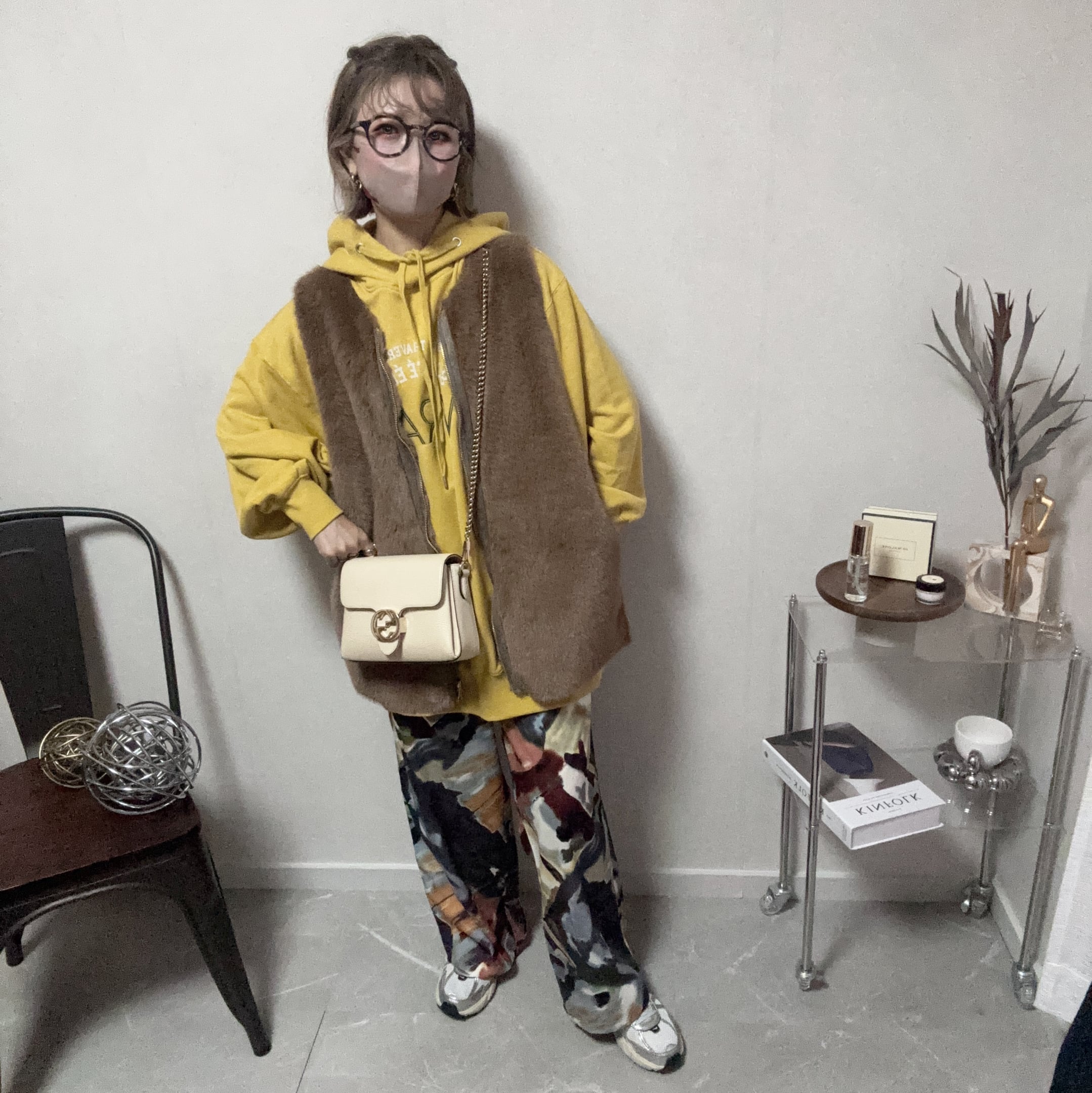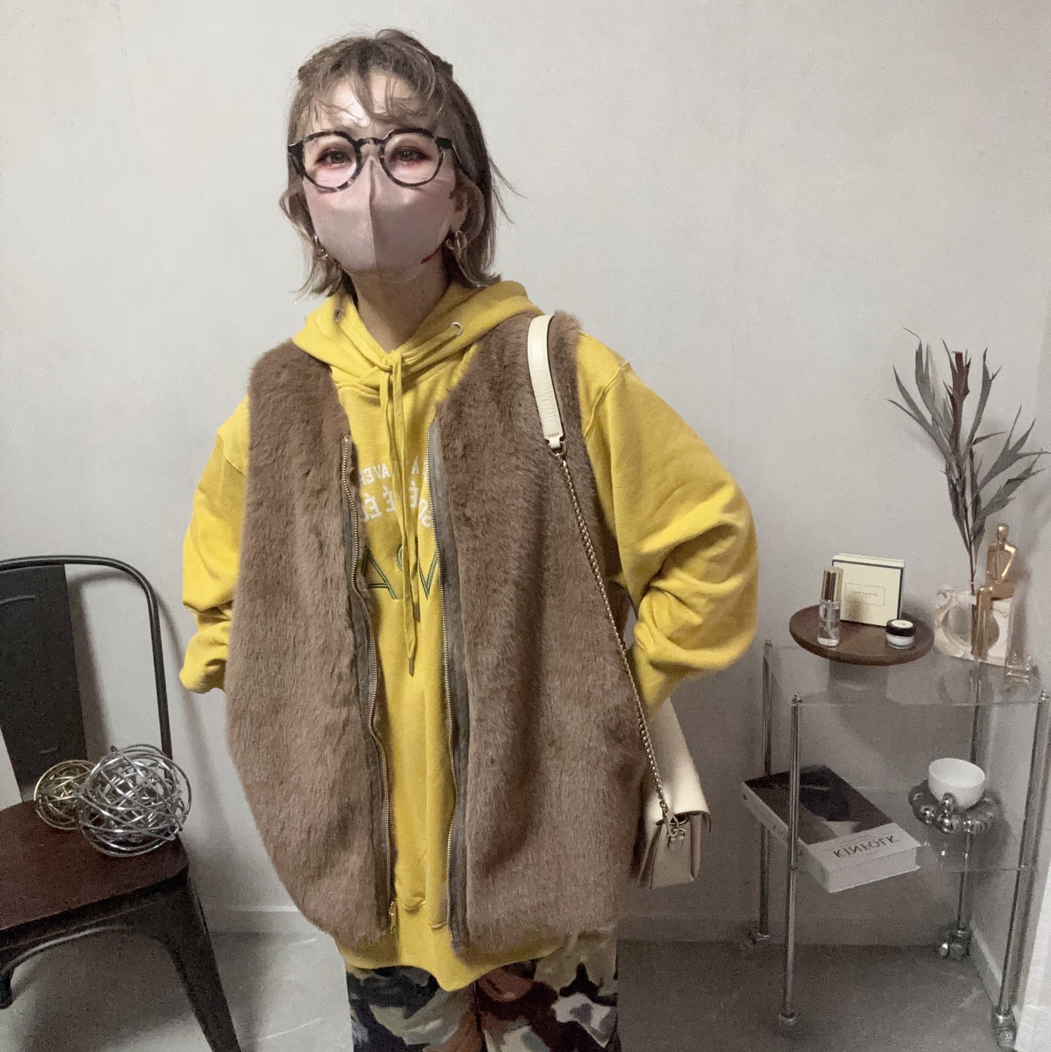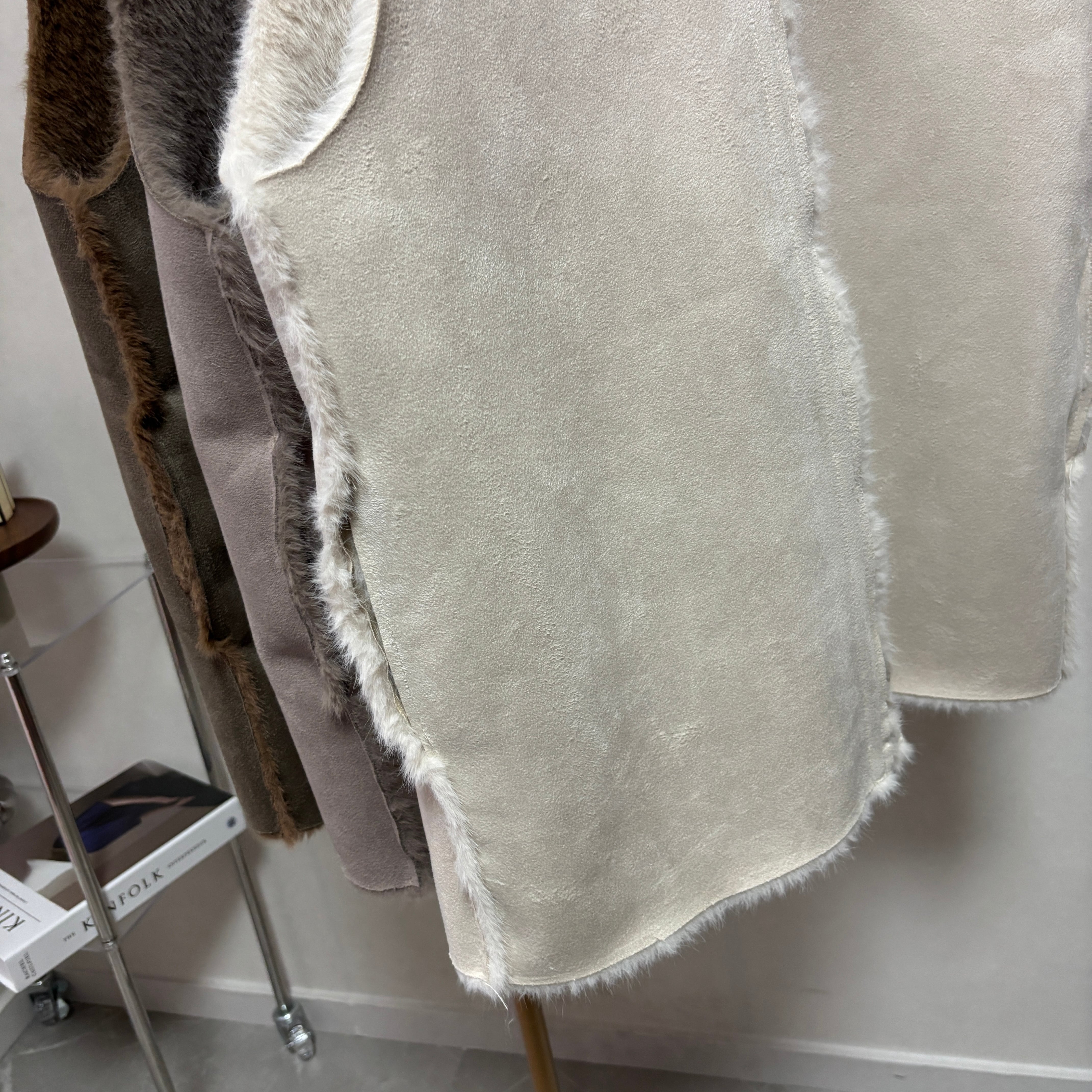 ラビット風エコファーとフェイクスエードのリバーシブル仕様で、1枚で異なる表情を楽しめるベストです。