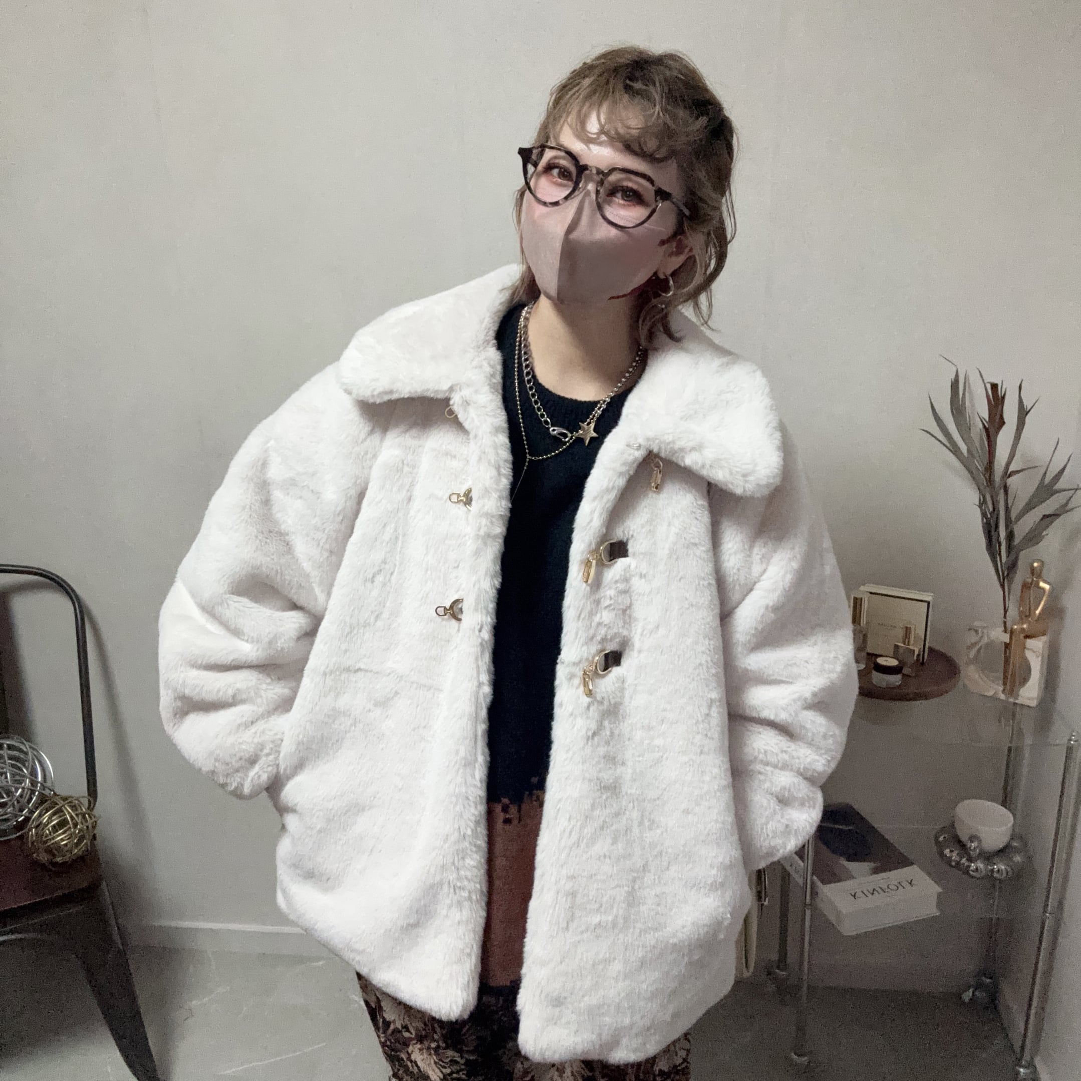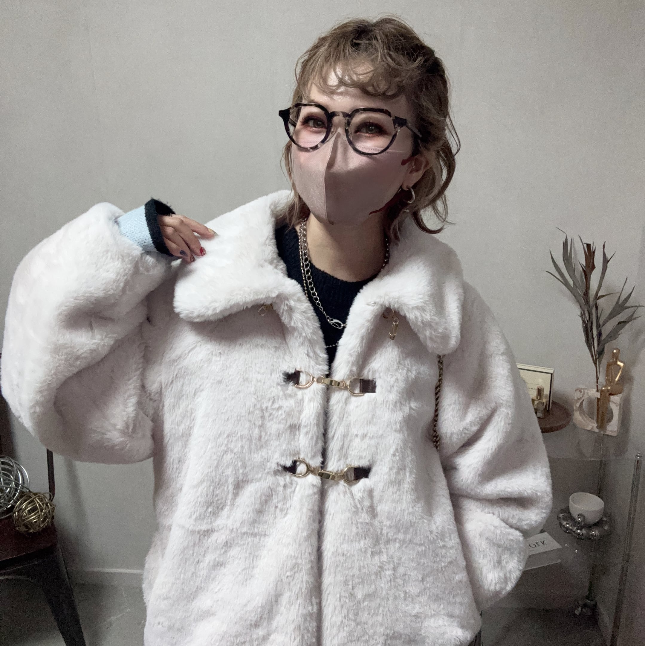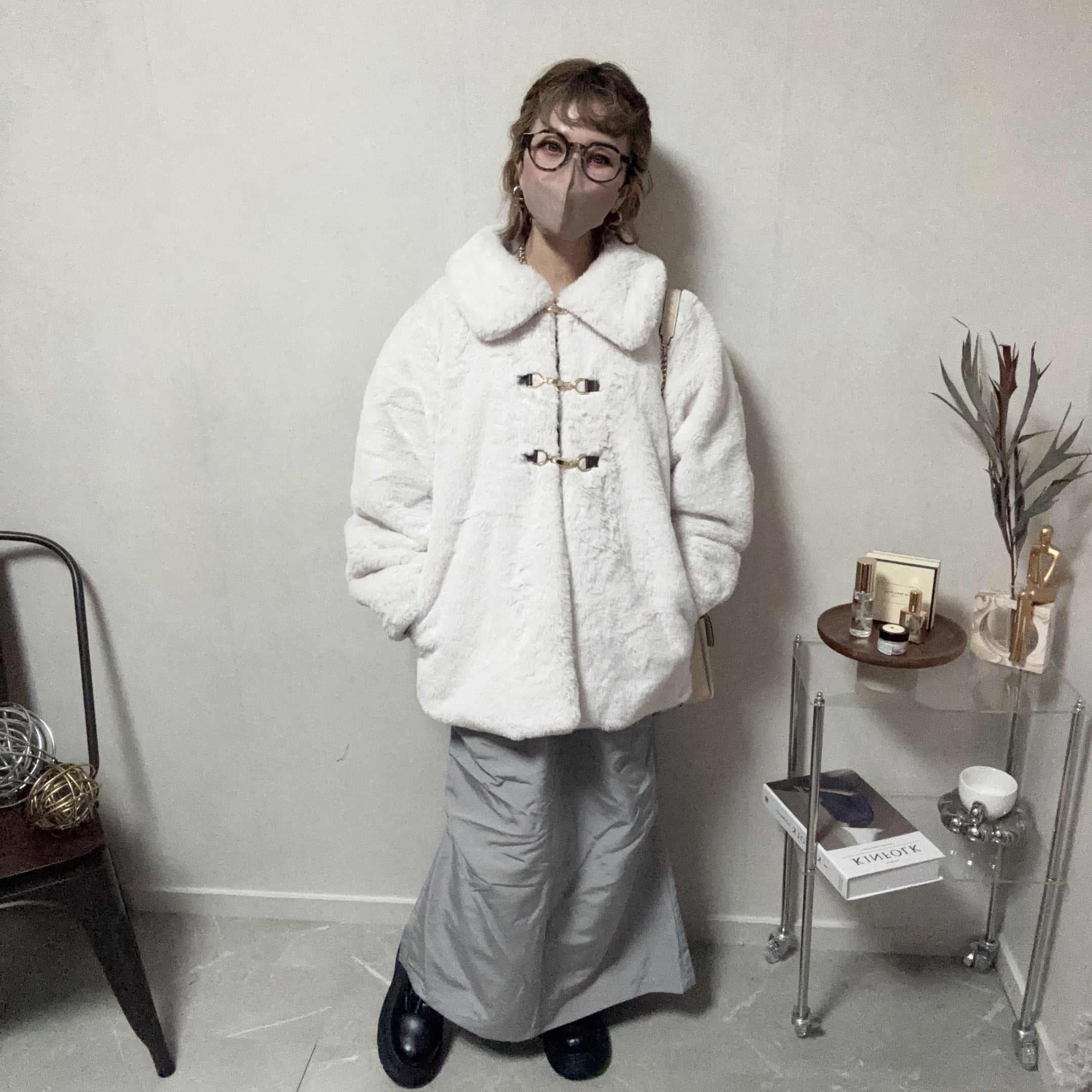 ラビット風エコファーを使用したレディーライクなミドル丈コート。