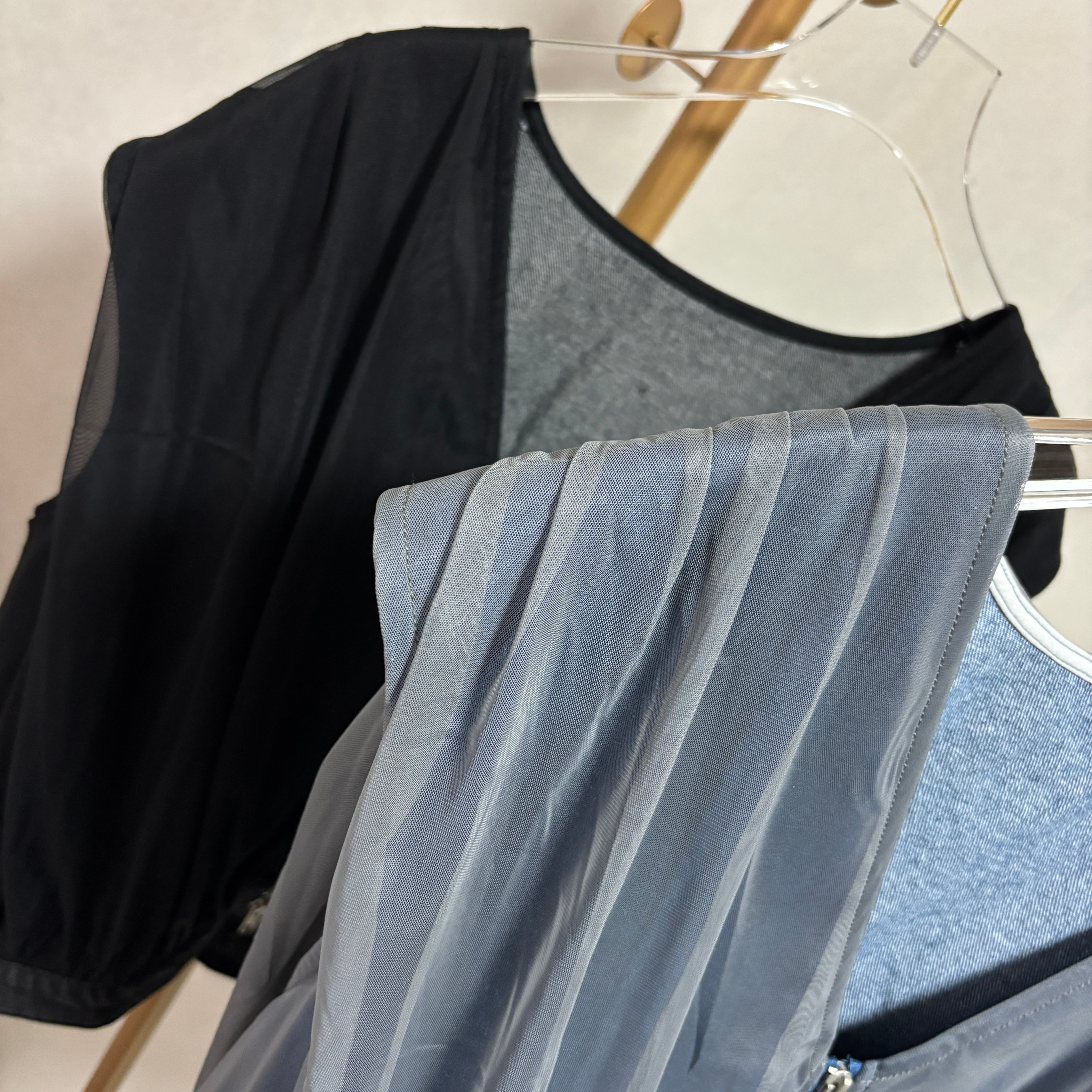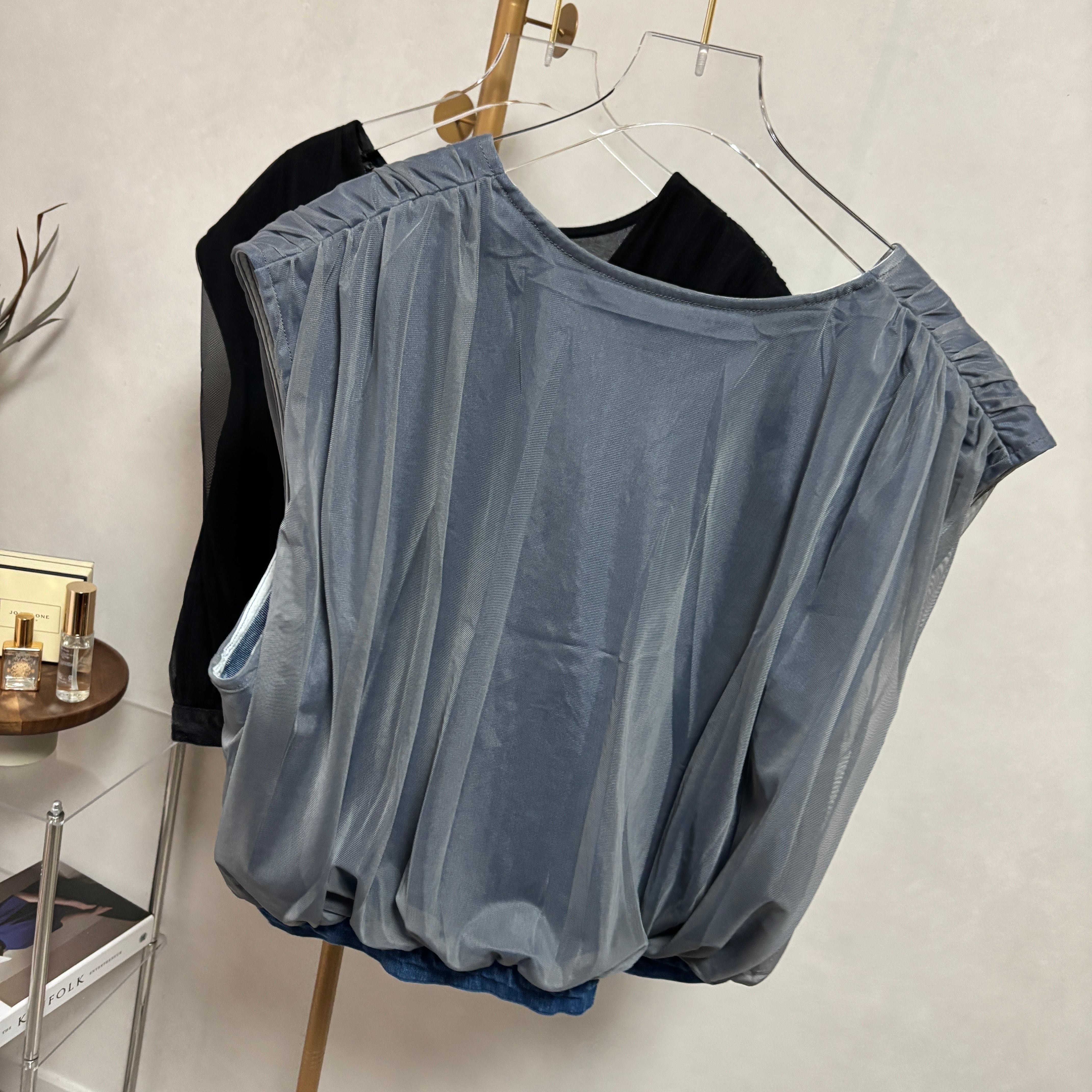 デニムのカジュアルさとチュールの軽やかさが融合し、洗練された抜け感を演出。