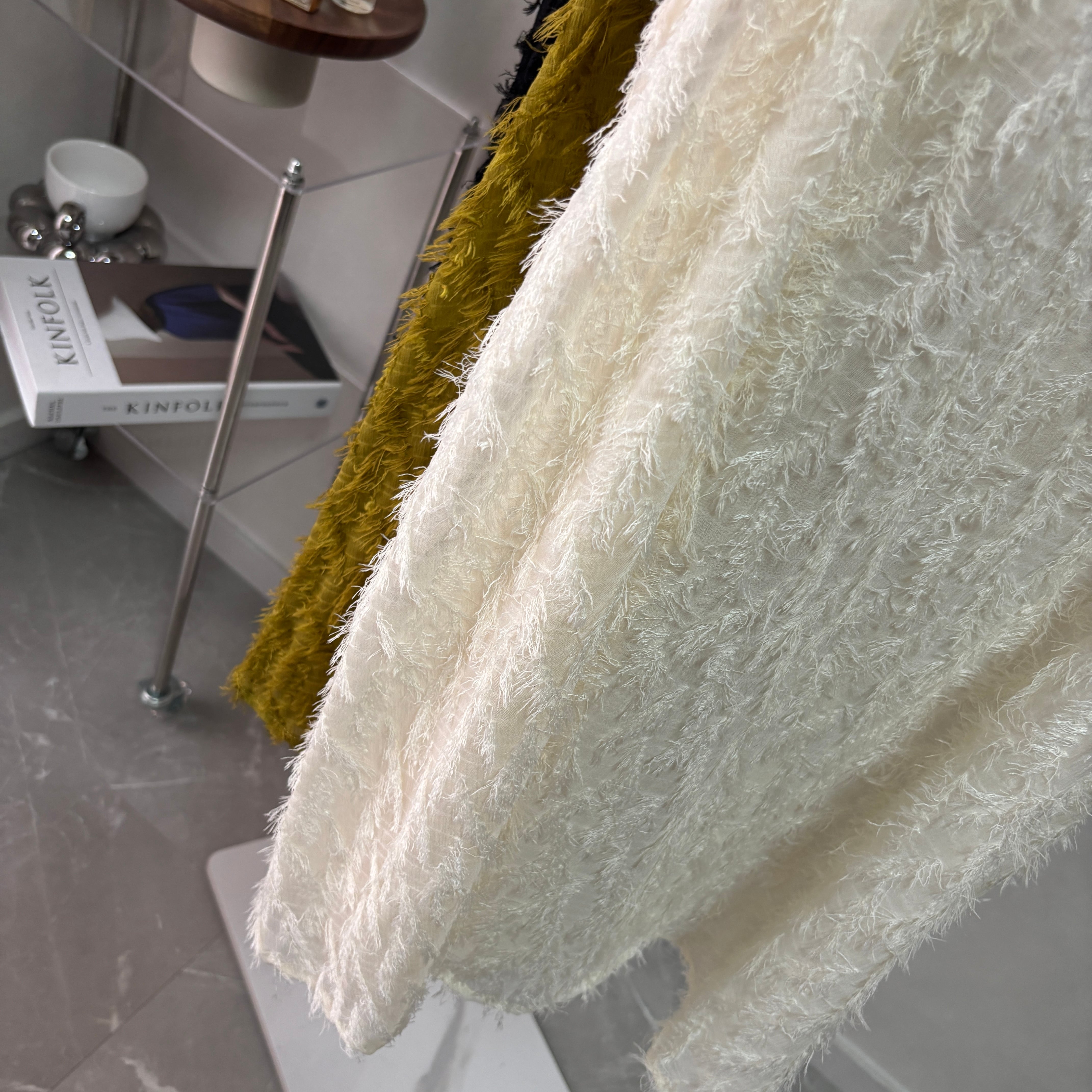 軽やかなシアー素材にフリンジが施され、女性らしい魅力を引き立てます。