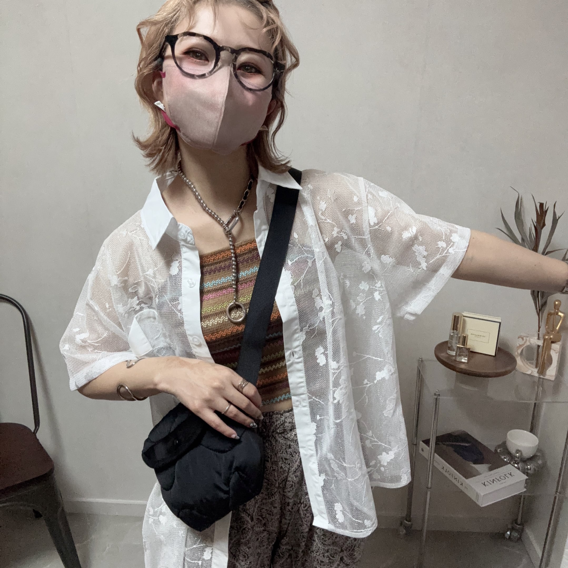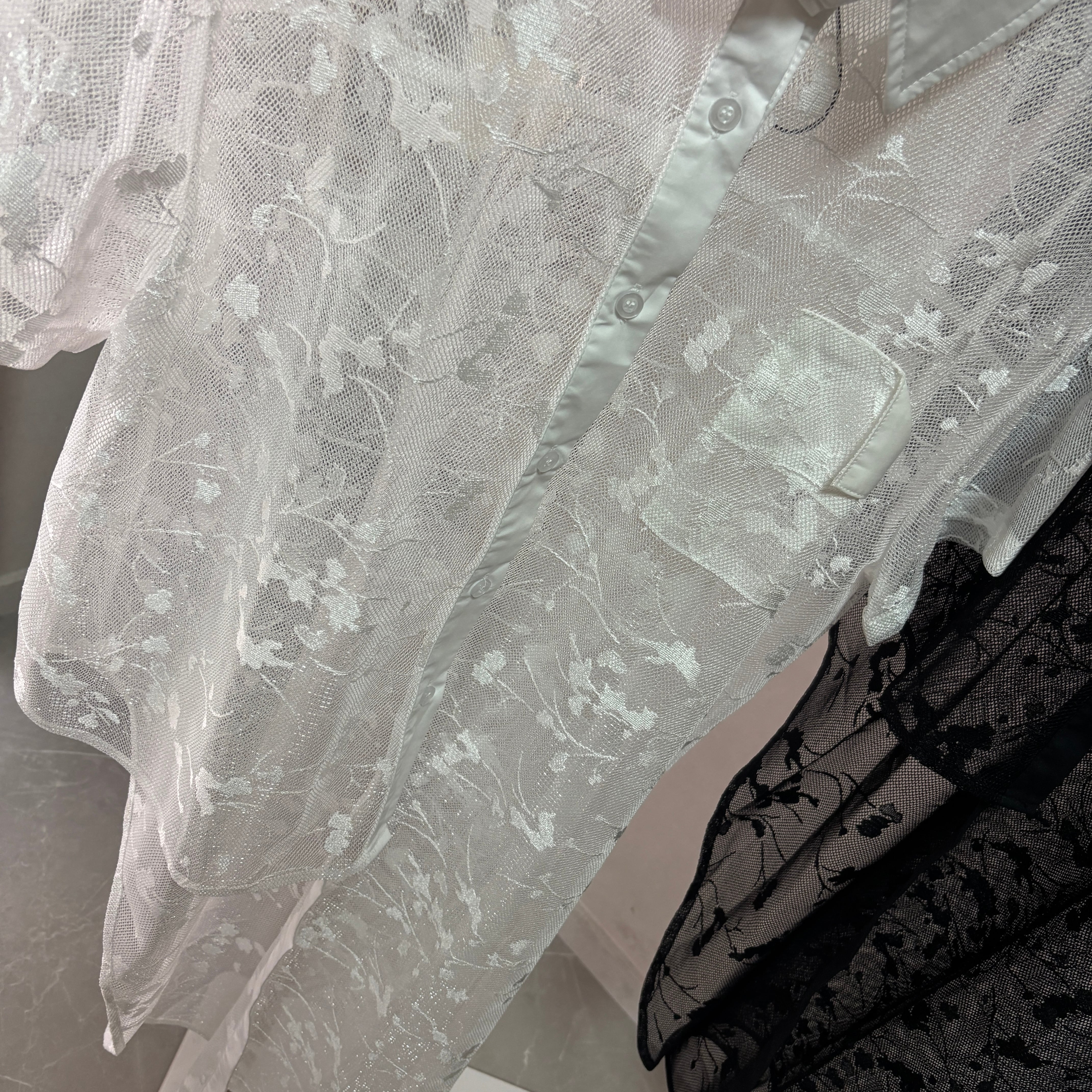 華やかなフラワー刺繍が施されたチュールシャツ。